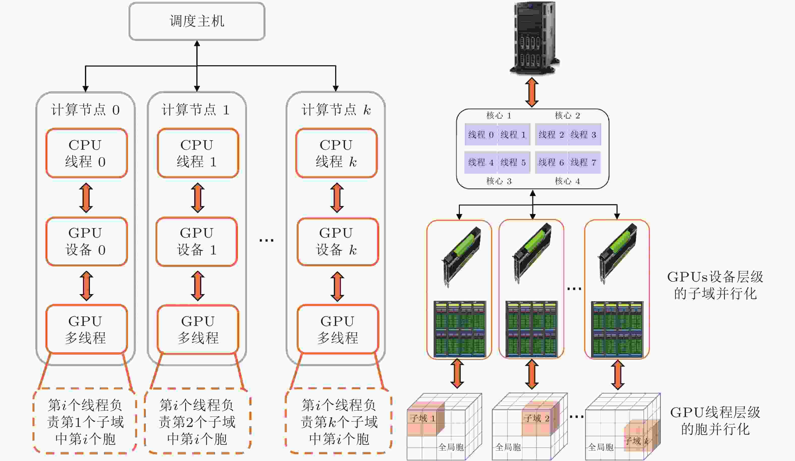 图 7 PSSCM方法采用的GPU集群计算架构(Li et al. 2022). 其中调度主机负责子域分割、合成以及计算资源调配. 每个计算节点由1个CPU线程和1个GPU设备组成, 独立节点中GPU负责处理子域中数据映射并传给对应的CPU执行子域内全局分析, 实现GPUs设备层级的子域并行化. GPU中的每个线程执行一次胞−胞映射, 实现GPU线程层级的胞并行化