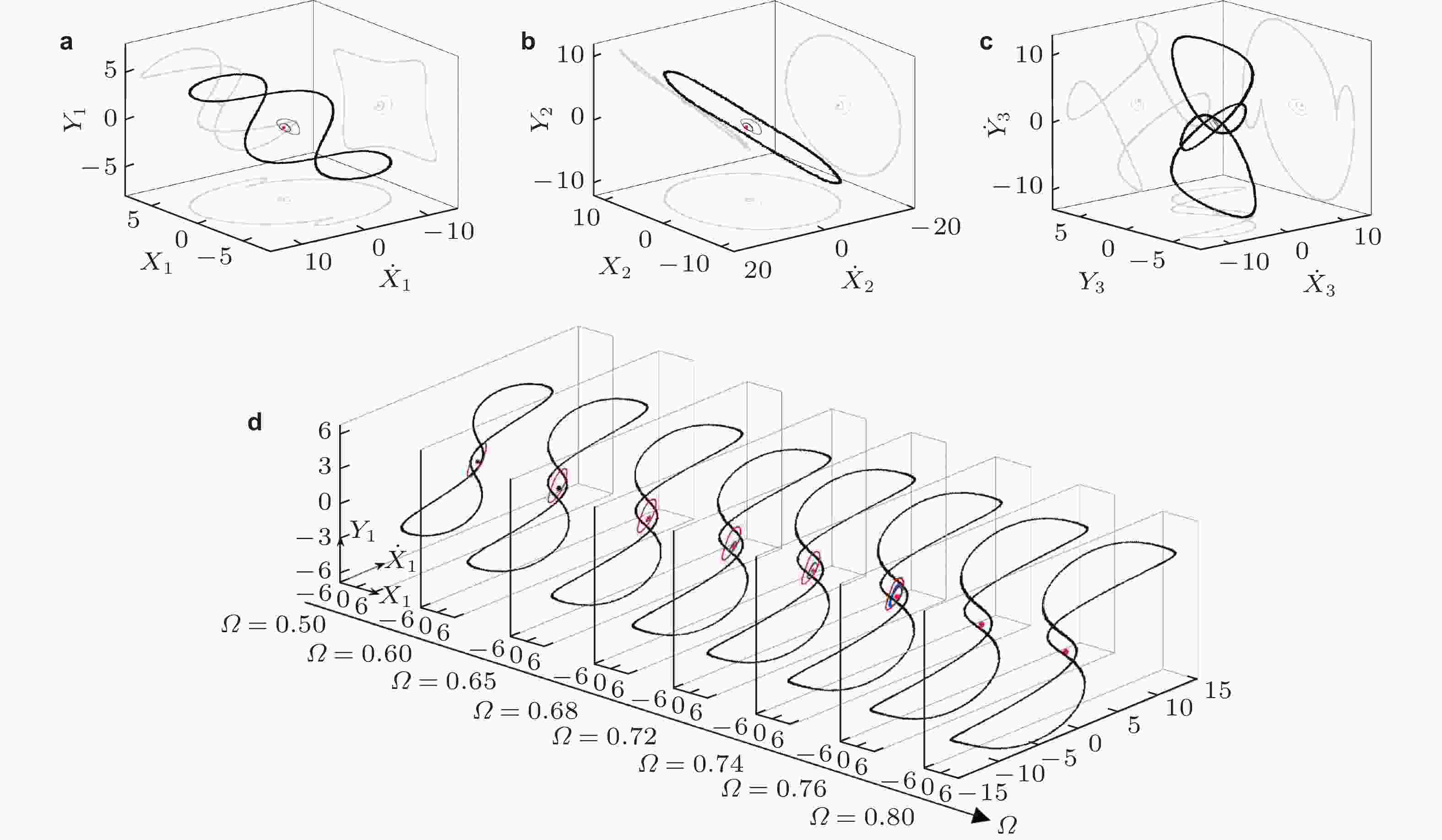 图 8 转子/定子碰摩诱发干摩擦反向涡动的全局响应和12维极限环分岔 (状态空间3维投影展示)(Li et al. 2022). (a) ~ (c) 多稳态全局响应相图; (d) 无碰摩周期响应Hopf分叉诱发间歇性准周期碰摩响应 (