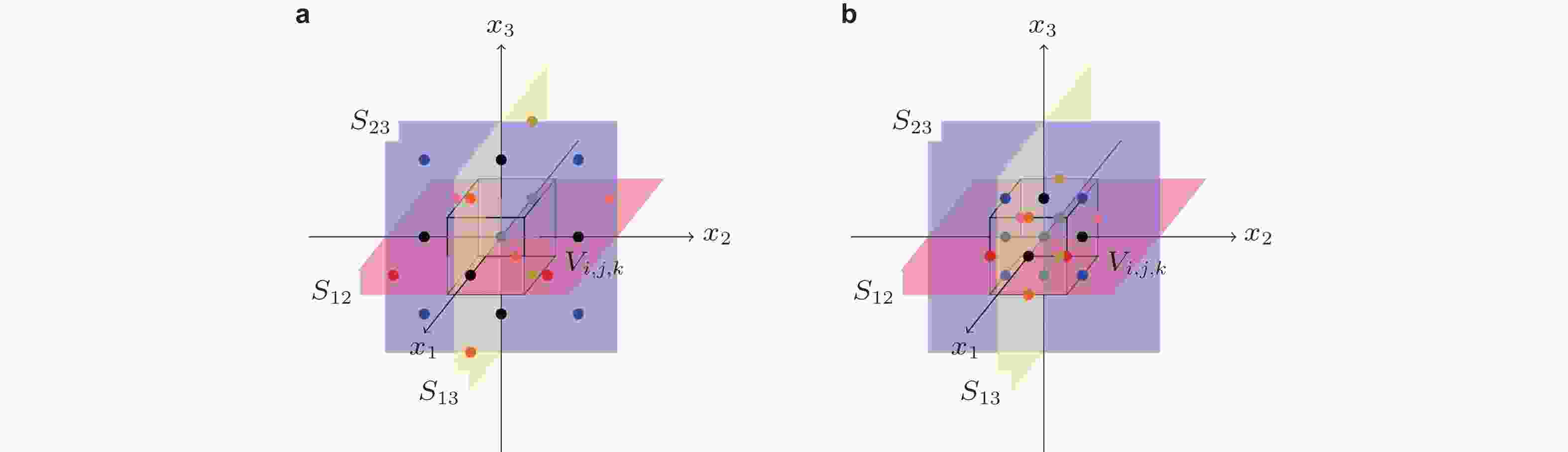 ${\varOmega } \approx 0.65$ ), 间歇性准周期碰摩 (极限环) 由突变分岔而失稳(${\varOmega } \approx 0.74$ ), 响应最终进入干摩擦反向涡动大幅振荡 (${\varOmega } = 0.76 \to 0.80$ )图 9 GCMSAI方法中插值参考点的配置. (a)邻接胞参考点(Liu et al. 2018), (b)插值胞内参考点(Wang et al. 2020)