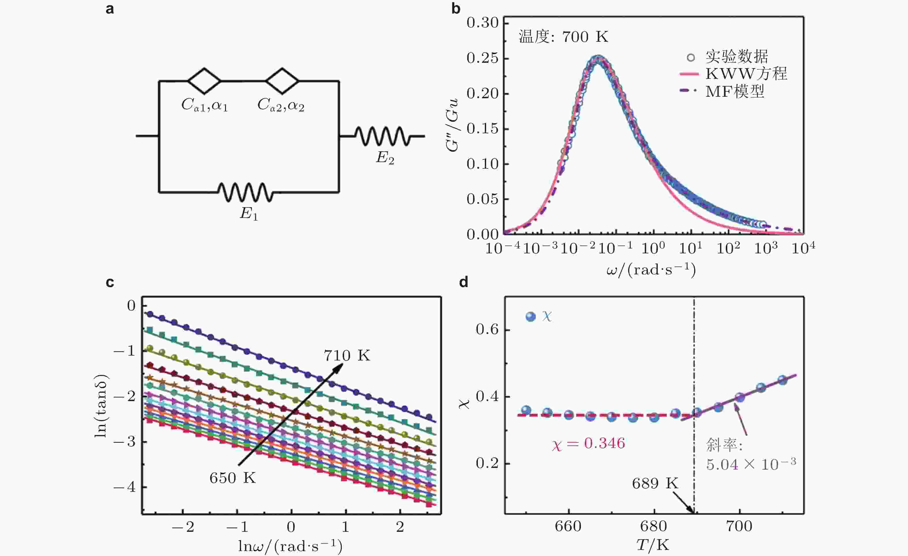 图 10 (a) 改进分数阶模型 (MF模型); (b) 不同模型描述实验数据的结果; 实线是由KWW方程拟合得到; 虚线是由 MF模型拟合得到的, 其中$ \dfrac{\left({G}_{\infty }-{G}_{0}\right)}{{G}_{\infty }}=0.94 $, $ {\tau }_\text{MF}=35.1 \;\text{s} $, $ \lambda =0.99 $, $ {\alpha }_{2}=0.35 $; (c) 不同温度下驱动频率与损耗因子$ \mathrm{tan}\delta $在对数下的关系; (d) 关联因子$ \mathrm{\chi } $随温度的演化趋势 (Zhu et al. 2023)