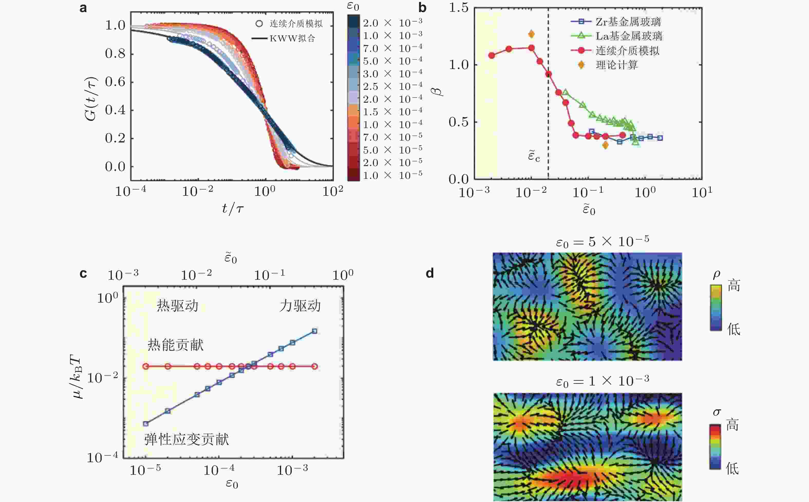 图 11 (a) 基于连续介质模型, 模拟不同应变下非晶合金的弛豫函数随归一化时间的变化, 实线是使用KWW方程拟合的曲线; (b)形状参数β随应变的演化规律; (c) 热能密度和弹性应变密度部分对化学势的贡献对比; (d) 热驱动和应力驱动弛豫过程中不同的原子动力学 (Zhu et al. 2024b)