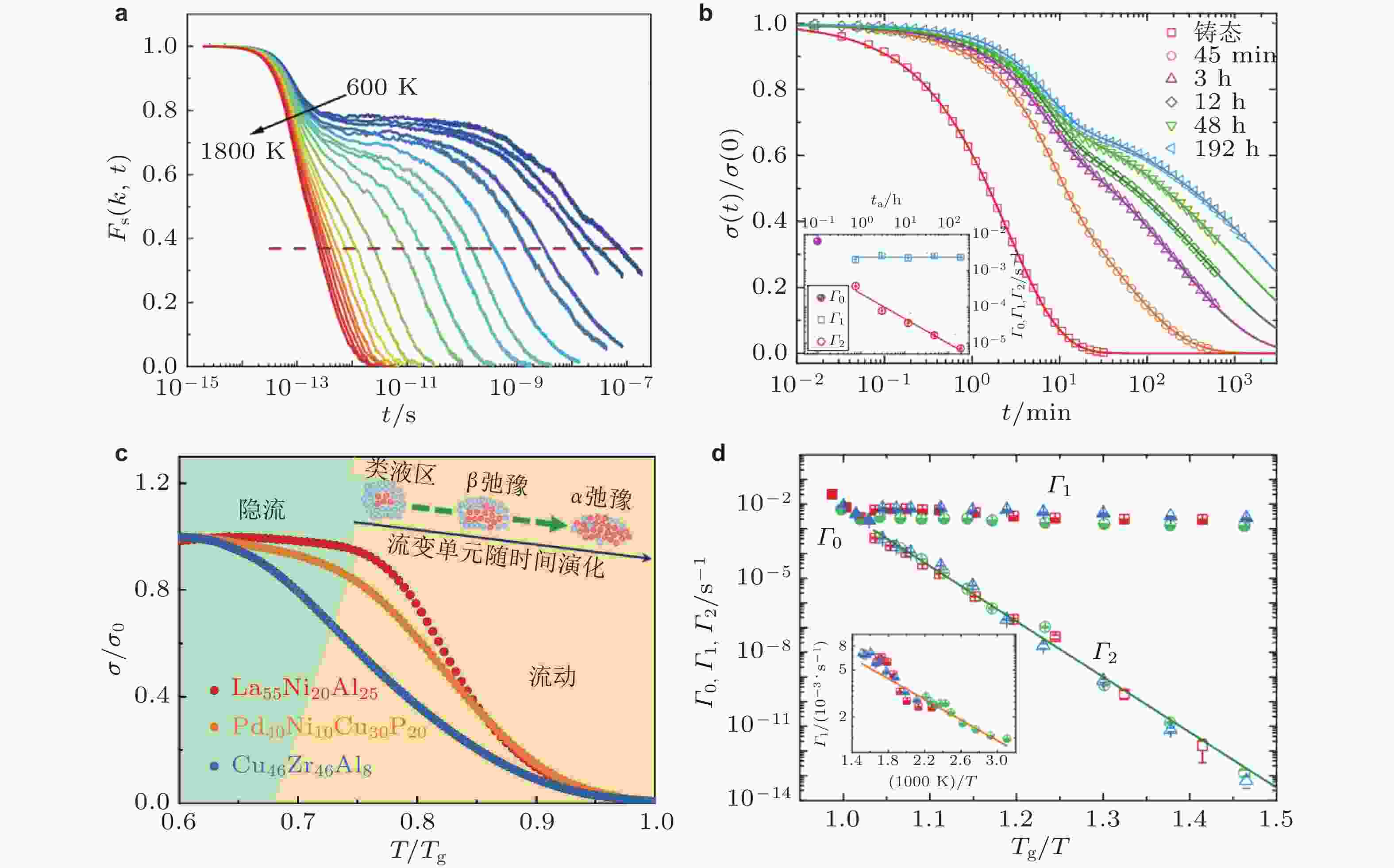 图 12 (a) 分子动力学模拟CuZr非晶合金宽温度范围内的中间散射函数 (Cao & Wang 2024); (b) Zr44Ti11Cu10Ni10Be25非晶合金的两步应力松弛曲线 (Luo et al. 2017); (c) 三种不同β弛豫形式非晶合金线形升温应力弛豫行为 (Lu et al. 2016); (d) 弛豫速率的劈裂 (Luo et al. 2017)