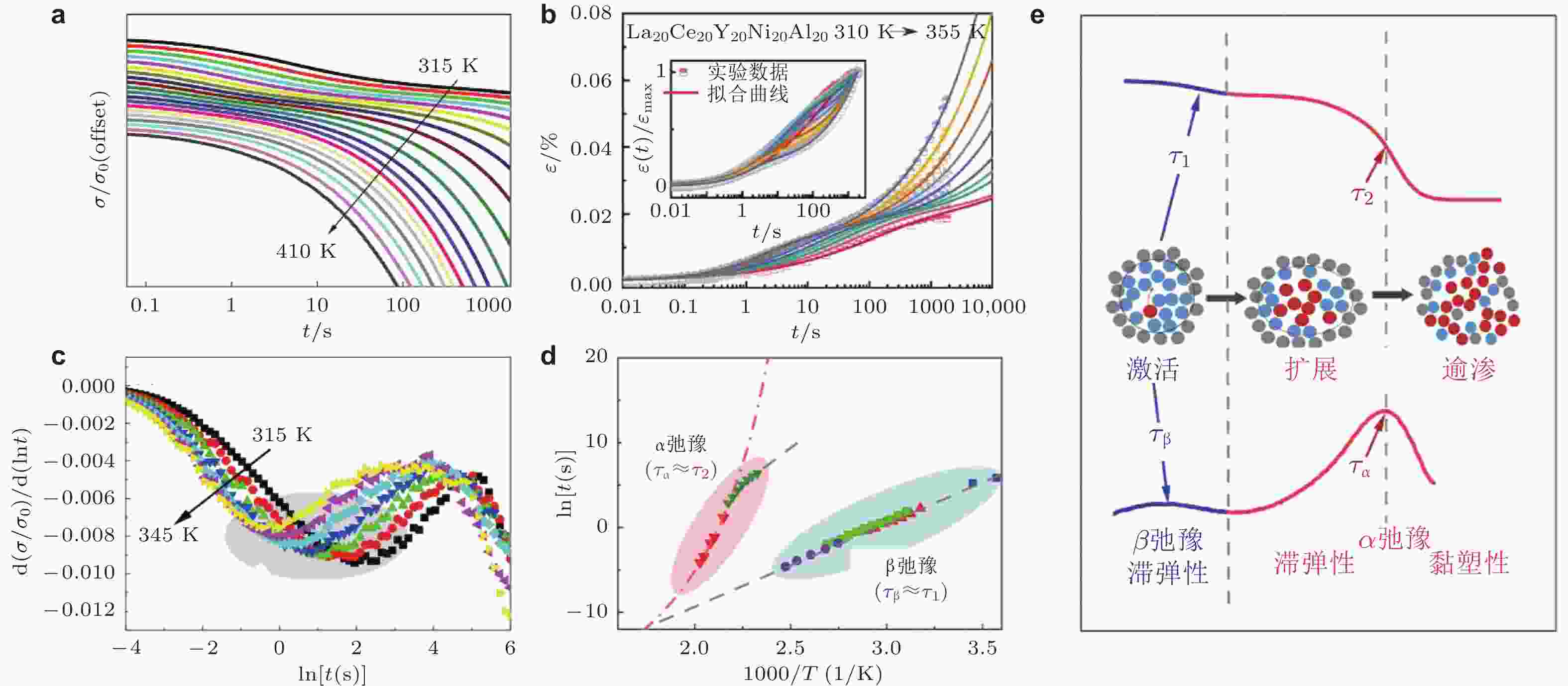 图 13 La基非晶合金(a)应力松弛 (Hao et al. 2023)和(b)蠕变过程 (Xing et al. 2024)现象; (c)从应力衰减速率与时间的关系中识别快速衰减过程的特征时间 (Hao et al. 2023); (d) 两步应力松弛特征时间和动态松弛的温度依赖性 (Hao et al. 2023); (e) STZ的激活, 扩展和湮灭导致的应力衰减和动态弛豫 (Hao et al. 2023)