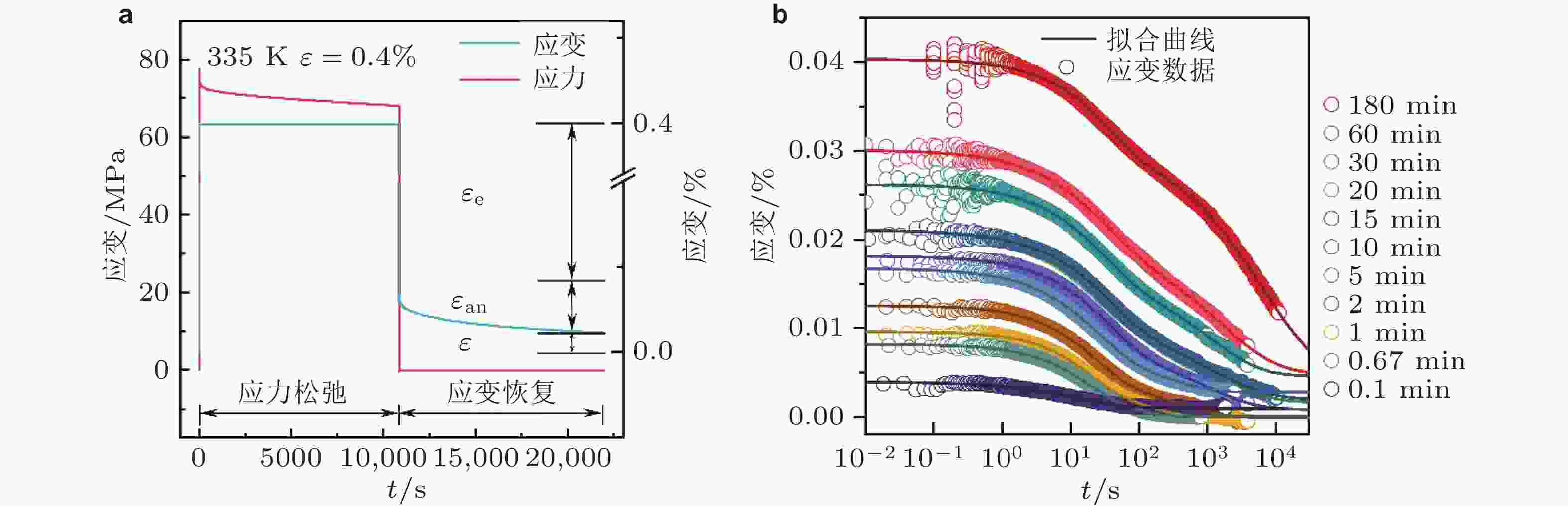 图 14 (a) 335 K下La基非晶合金 应变为0.4%的应力松弛与应变回复过程; (b) 不同松弛时间后的应变回复的非弹性分量结果, 其中的实线为拟合结果 (Xing et al. 2025)