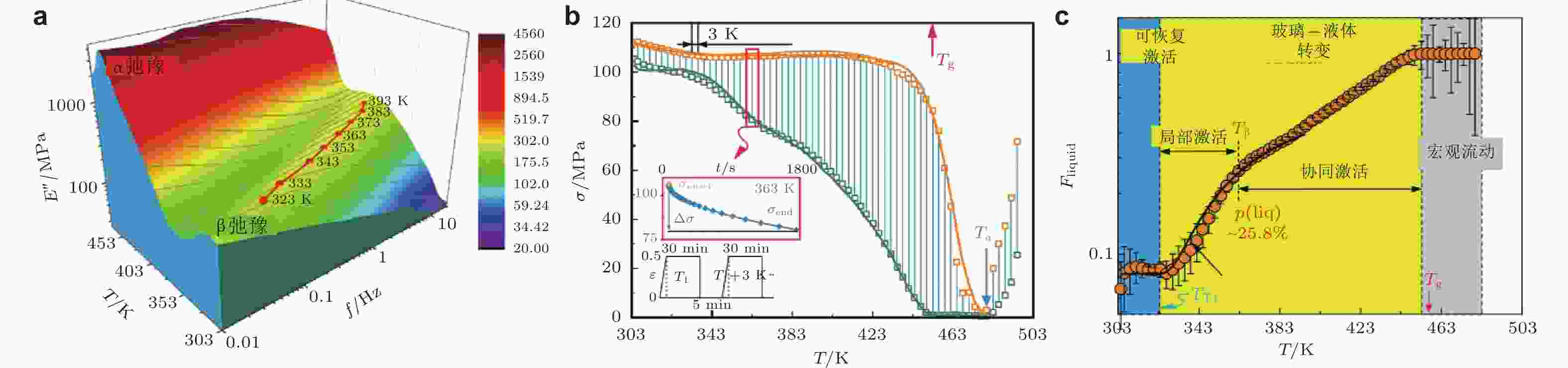图 15 (a) La基非晶合金在不同温度下的动态力学谱, 以三维形式呈现了损耗模量随温度和频率的变化关系; (b)不同温度下的应力松弛光谱; (c)液态区域比例随温度的演化 (Wang et al. 2014)