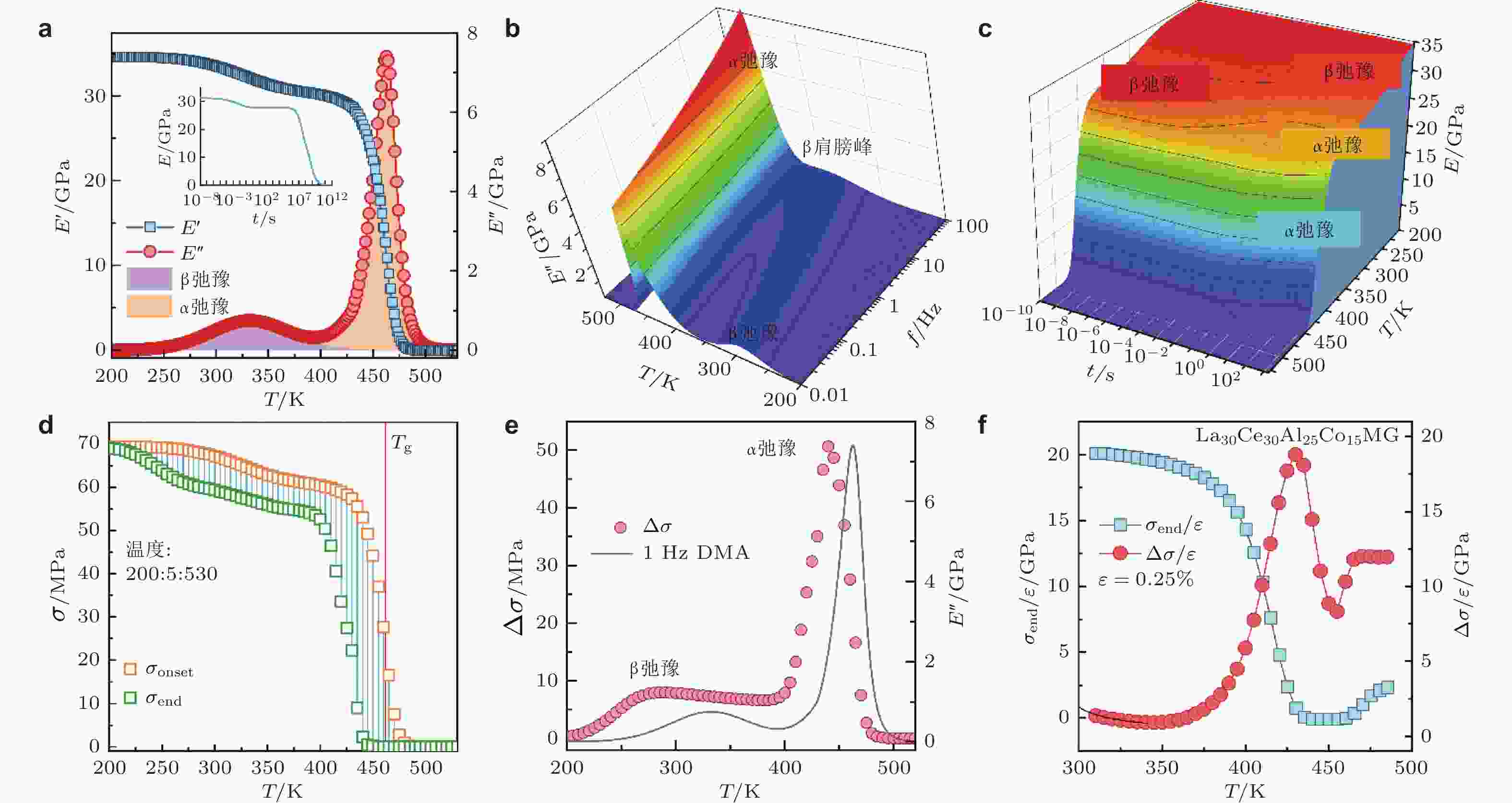 图 16 (a) 等时储能模量和损耗模量的QPD模拟, 插图显示了从300 K开始的大时间尺度的应力衰减模拟; QPD模型计算得到的(b) 三维损耗模量图和(c) 三维应力松弛图, 从冷蓝色到暖红色的颜色过渡表示模值的变化; (d) “竖琴”形应力松弛谱; (e) 应力降Δσ随温度的演化曲线和在1 Hz下获得的等温DMA曲线; (f)La30Ce30Al15Co25非晶合金应力弛豫谱实验结果中σend/ε和Δσ/ε随温度的演化 (Xing et al. 2025)