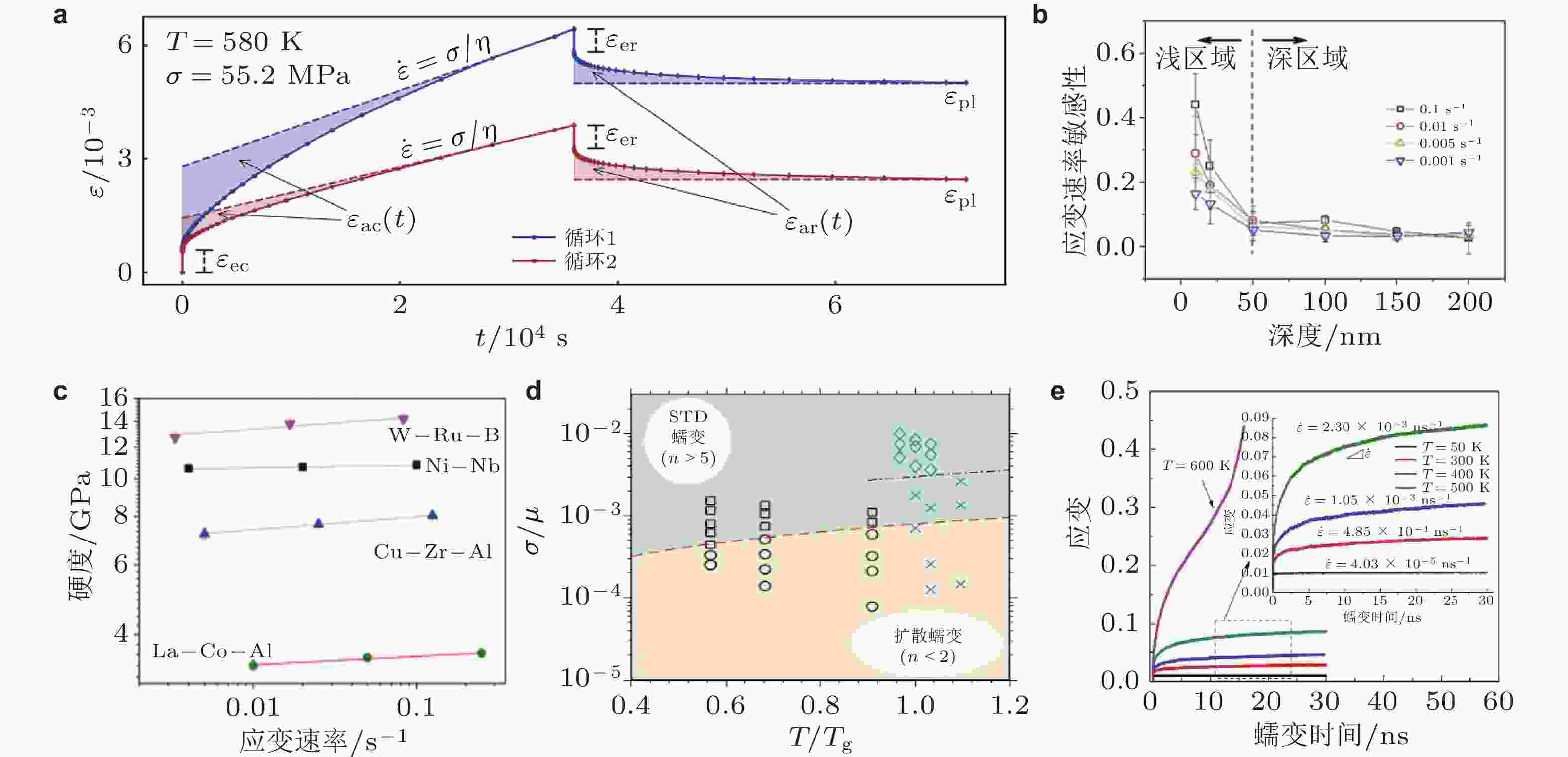 图 18 (a) Vit105非晶合金的蠕变及回复行为 (Nabahat et al. 2022); (b) 应变速率敏感程度与初始蠕变深度的关系 (Wang et al. 2013); (c) 纳米压痕硬度值与等效应变速率 (Ma et al. 2015); (d) 归一化应力−温度主导区域的蠕变机理图 (Cao et al. 2017); (e) 不同温度下Cu64Zr36非晶合金的蠕变曲线 (Zhu et al. 2024a)