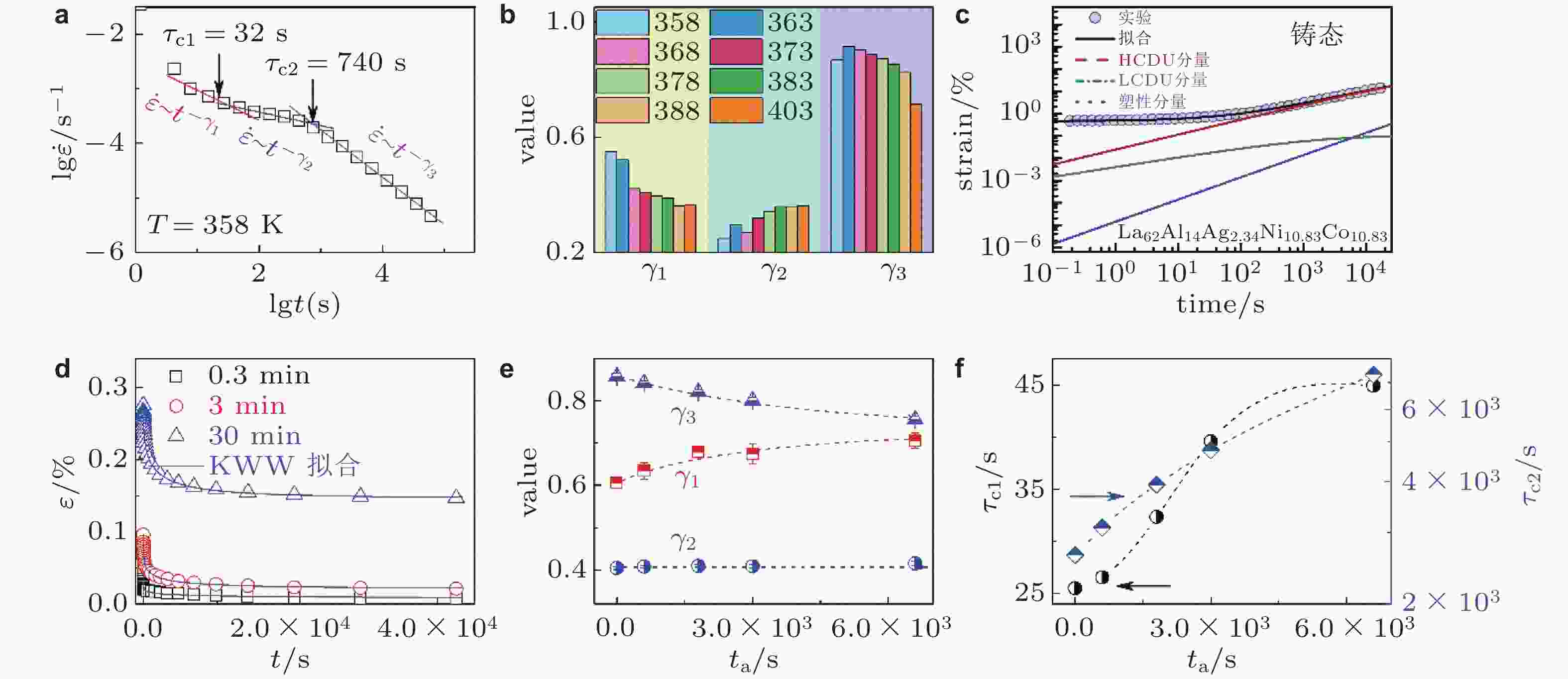 图 19 (a) La30Ce30Ni10Al20Co10非晶合金的三阶段幂律蠕变, 及其(b)幂律指数随温度演化过程 (Zhang et al. 2021); (c) La62Al14Ag2.34Ni10.83Co10.83非晶合金的蠕变实验曲线及基于QPD模型的拟合曲线 (Liang et al. 2024); (d) 358 K时 La30Ce30Ni10Al20Co10非晶合金不同蠕变时间后回复过程中应变随时间的演化, 插图为变形分量的解耦示意图 (Zhang et al. 2021); 三阶段幂律蠕变(e)幂律指数和(f)转折时间随老化时间演化过程 (Zhang et al. 2022a)