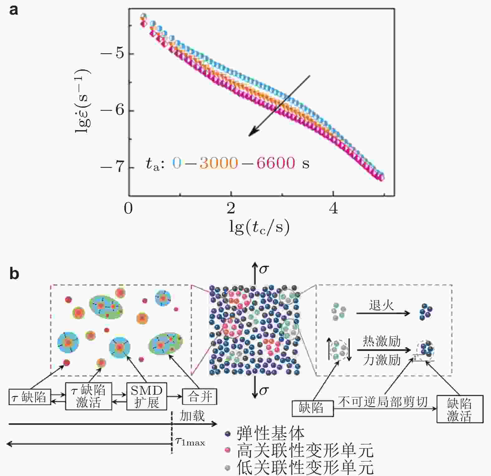 图 20 (a) La30Ce30Ni10Al20Co10非晶合金不同老化时间后的三阶段幂律蠕变 (Zhang et al. 2022a); (b) 非晶合金蠕变过程的双机制变形机制示意图 (Zhu et al. 2024a)