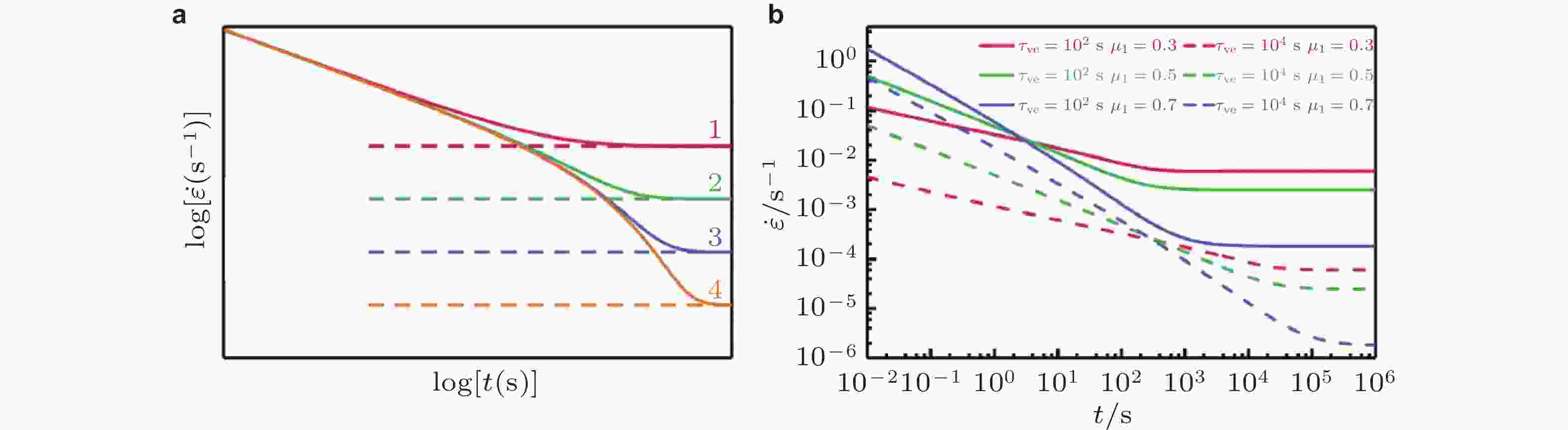 图 21 (a) 通过改变不可逆变形的应变速率, 总应变速率随时间演变示意图; (b) 通过改变$ {\tau }_\text{ve} $和$ {\mu }_{1} $得到的式(49)的应变速率随时间的双对数图, 其中$ {A}_\text{ve} $和$ {A}_\text{p} $被设置为1 (Zhu et al. 2024a)