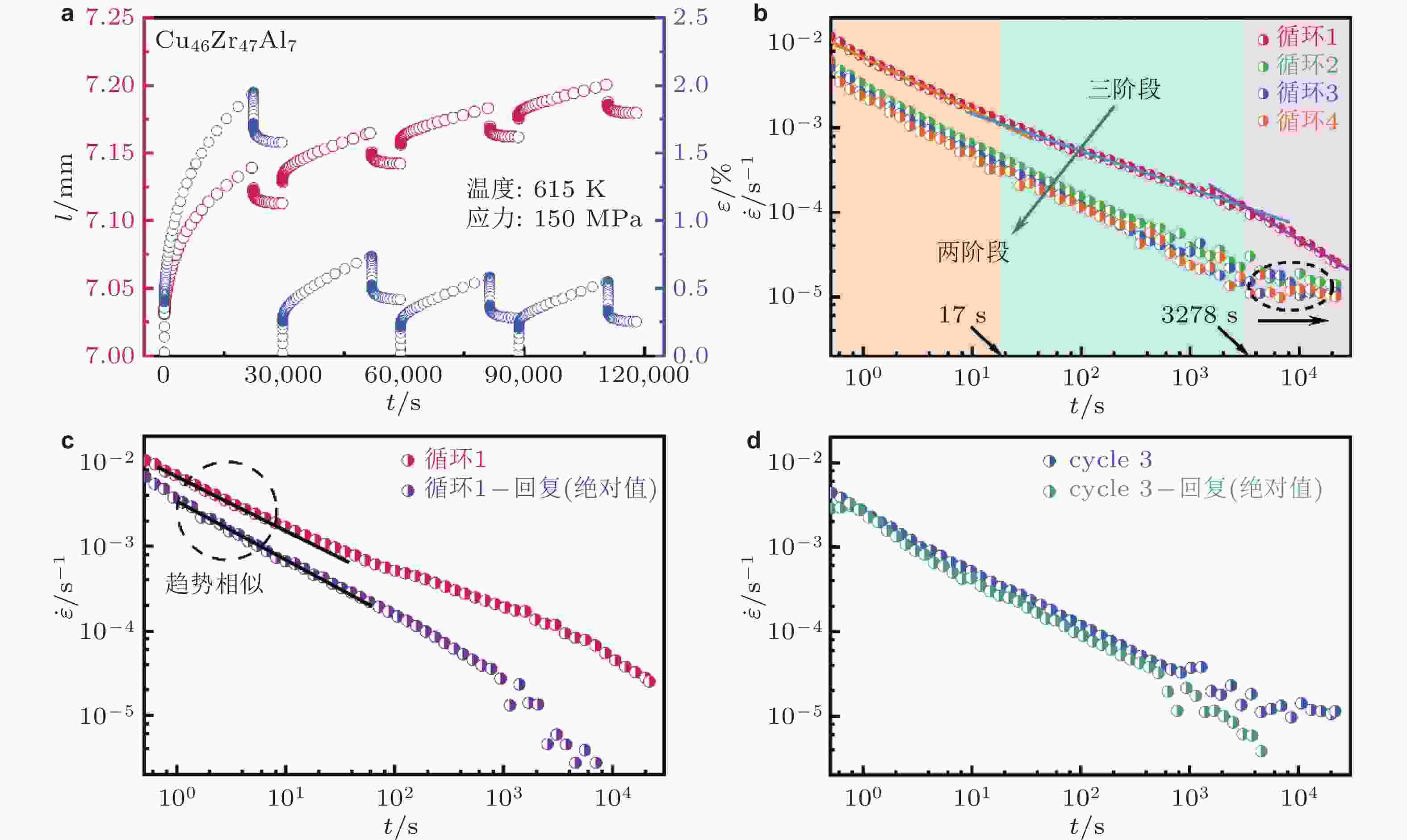 图 22 (a) 615 K和150 MPa下测得的长度和应变随时间的演变曲线; (b) 四个循环过程中蠕变应变速率随时间的双对数图; (c) 第一次循环期间蠕变和恢复应变速率随时间的双对数演变趋势; (d) 第三次循环期间蠕变和恢复应变速率随时间的双对数演变趋势 (Zhu et al. 2024a)