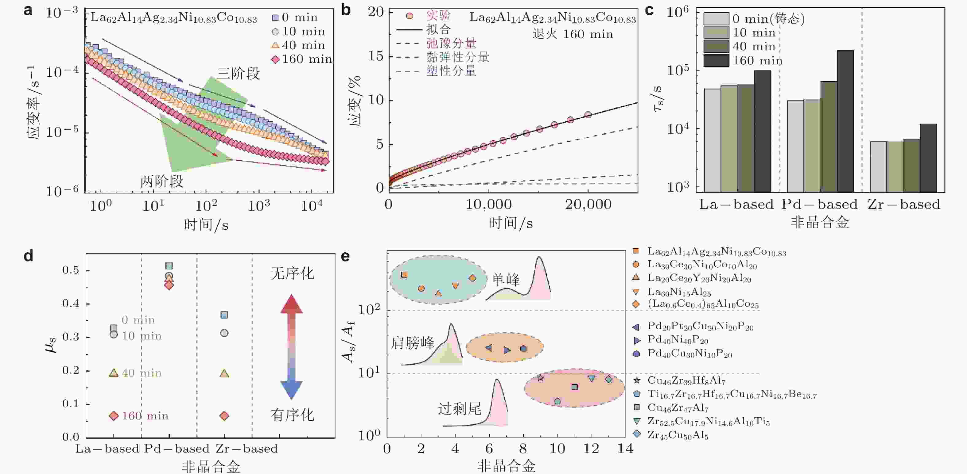 图 23 (a) 不同老化时间的非晶合金蠕变幂律行为 (Liang et al. 2024); (b)非晶合金退火160 min后蠕变变形及其模型拟合 (Liang et al. 2024); (c)不同非晶合金高关联变形单元特征弛豫时间随老化时间的演化 (Liang et al. 2024); (d)非晶合金蠕变过程高关联变形单元关联因子随老化时间的演化 (Liang et al. 2024); (e) 不同非晶合金蠕变过程中高关联变形单元与低关联变形单元的强度比值 (Liang et al. 2024)