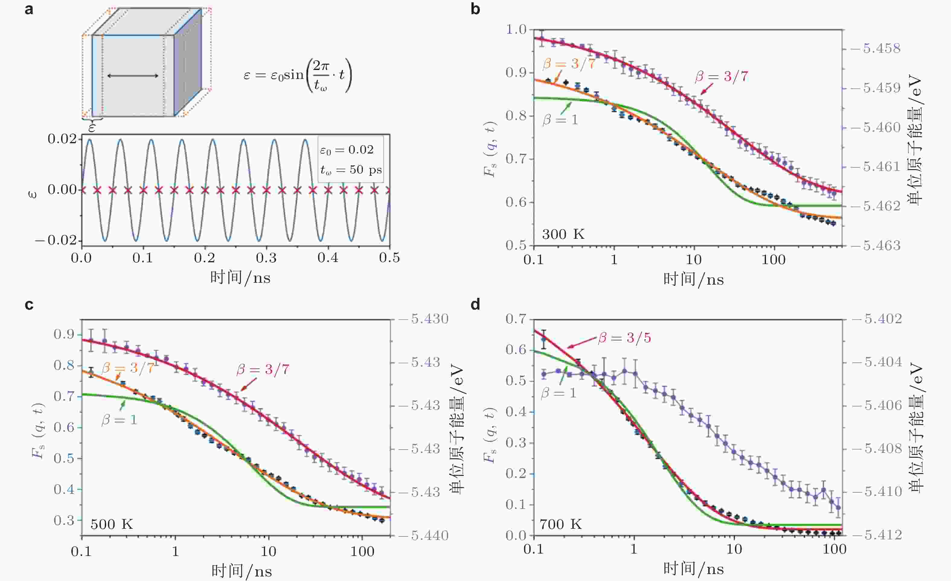 图 24 (a)振动加速Zr70Cu30非晶合金老化仿真过程示意图; 在300 K (b), 500 K (c)和700 K (d)加速时效过程中的自中间散射函数和势能随时间演变 (Sun et al. 2023)