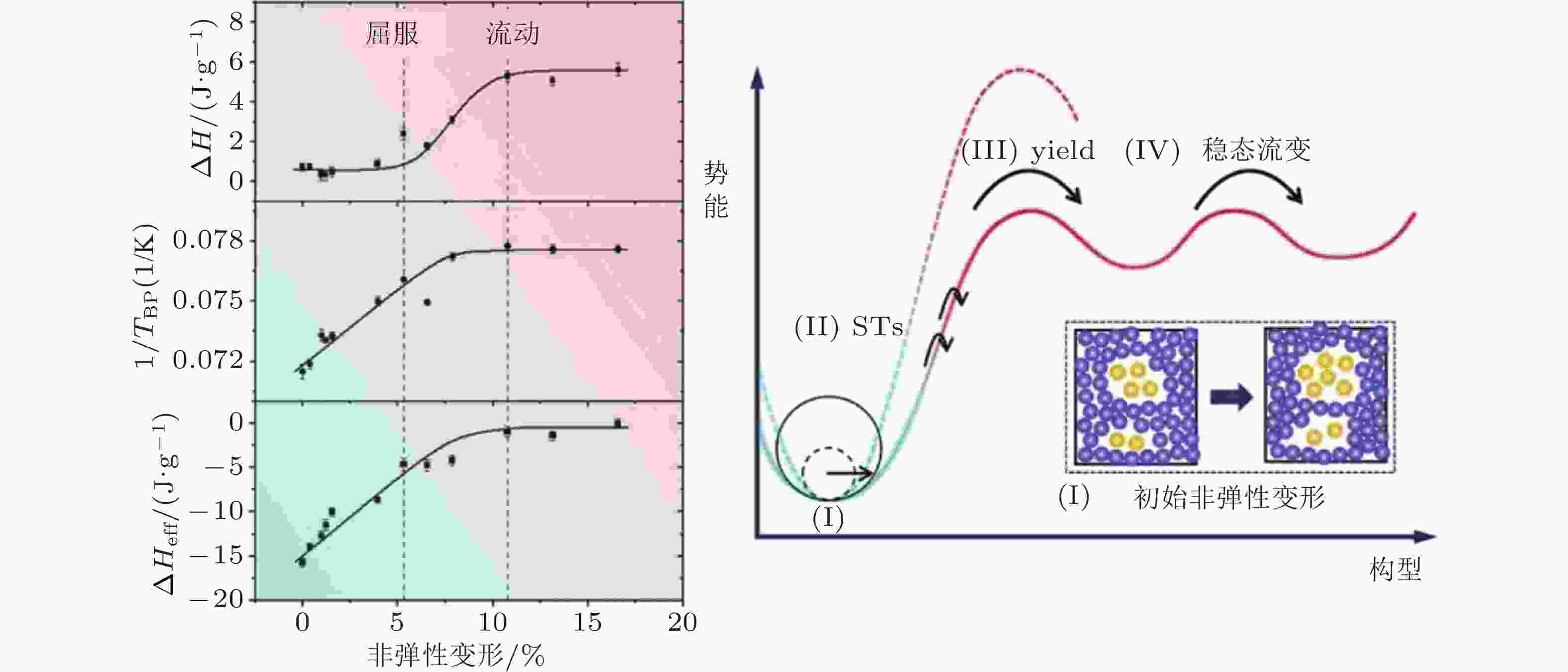 图 26 弛豫焓, 玻色峰温与有效焓随非弹性应变的演化过程 (Gao et al. 2024)