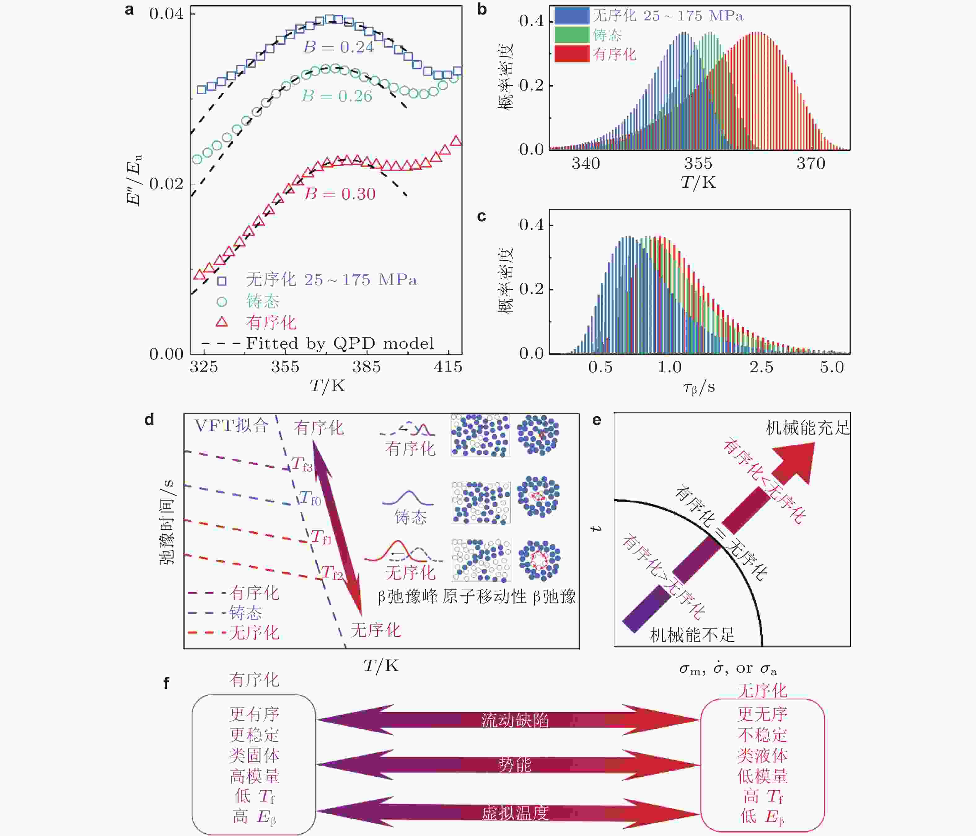 图 27 机械循环实现非晶合金年轻化 (Zhang et al. 2022b). (a) La30Ce30Ni10Al20Co10 非晶合金铸态, 退火态和机械循环处理后样品损耗模量E′′/Eu随温度演化过程, 虚线为QPD模型拟合结果; 弛豫单元分别沿(b) 温度梯度和(c) 特征弛豫时间梯度分布情况; (d) 老化和年轻化对弛豫时间演化影响机制示意图, 构建了缺陷, 老化, 年轻化与β弛豫过程之间关联; (e) 机械循环过程中老化与年轻化动态竞争谱图; (f) 年轻化与老化作用下非晶合金结构指标