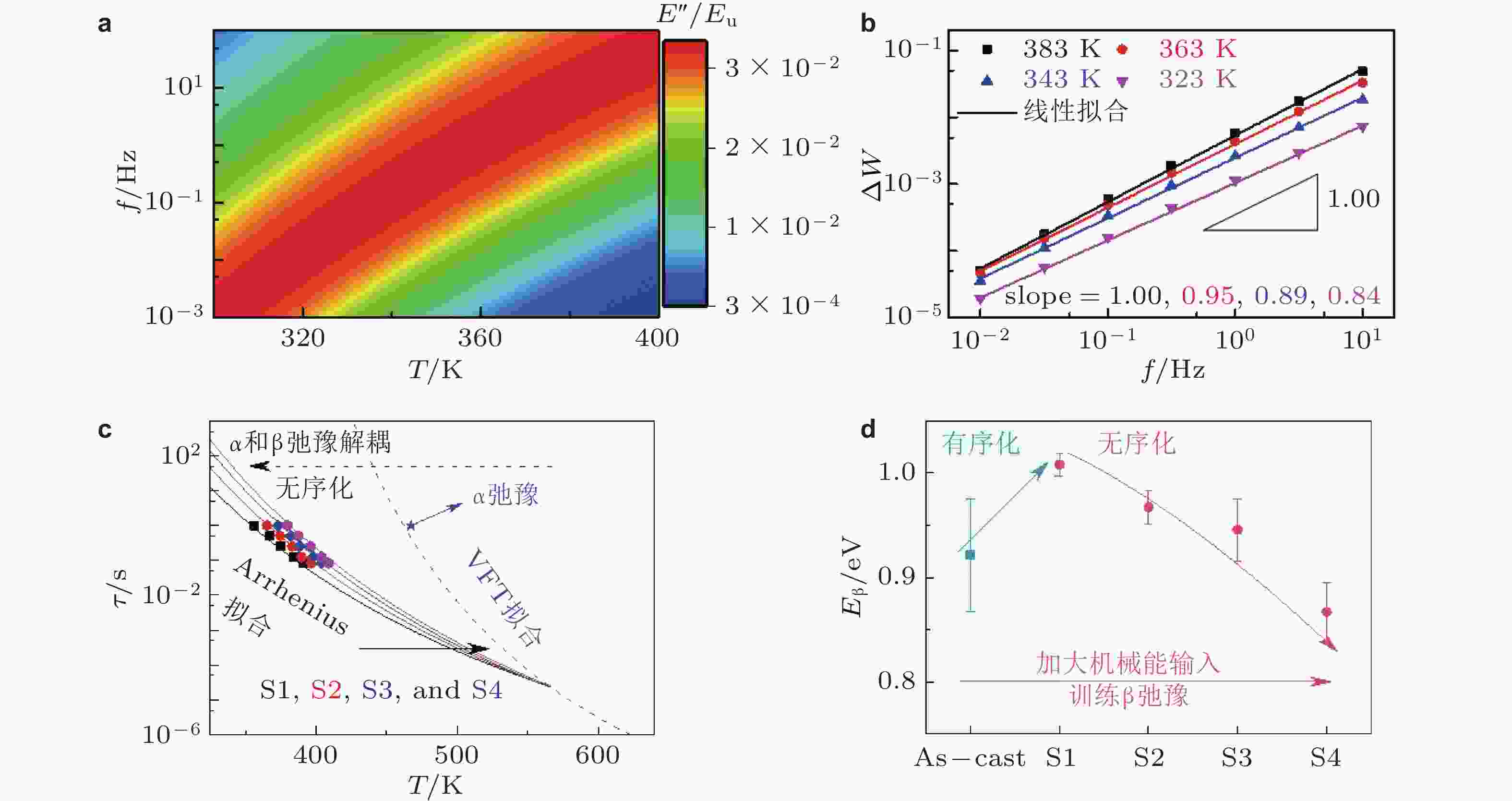 图 28 训练β弛豫实现年轻化 (Zhang et al. 2024a). 理论计算不同训练频率和温度下(a) 归一化损耗模量演化规律; (b) 不同温度下范∆W随训练频率演化过程; (c) 不同训练方案下β弛豫和α弛豫特征时间随温度演化过程; (d) 不同训练方案下β弛豫激活能演化规律
