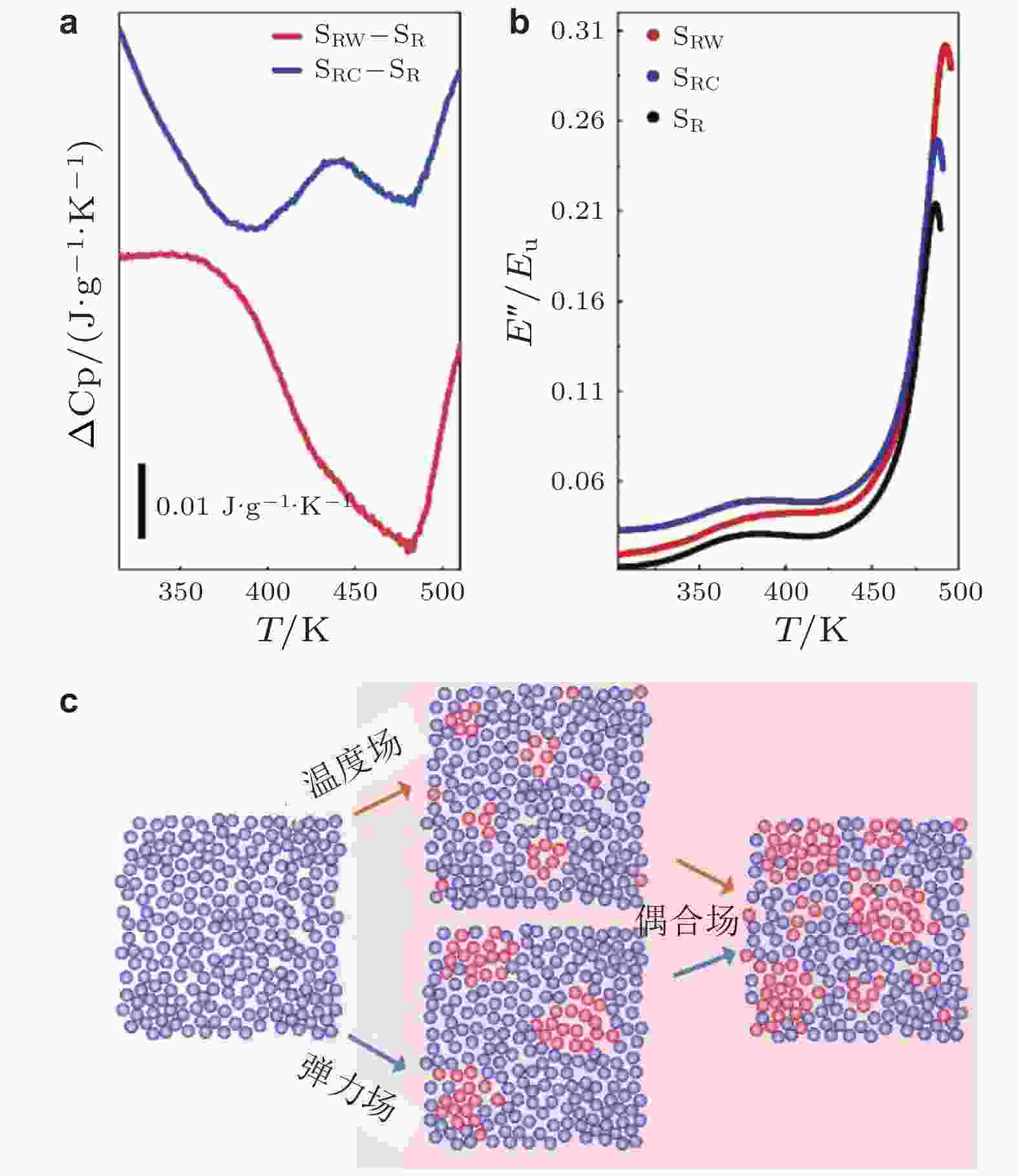 图 29 (a) ~ (b)室温缠绕、深冷循环与耦合处理样品的热流曲线与损耗模量演化过程 (Yang et al. 2025); (c)处理过程原子演化示意图 (Yang et al. 2025)