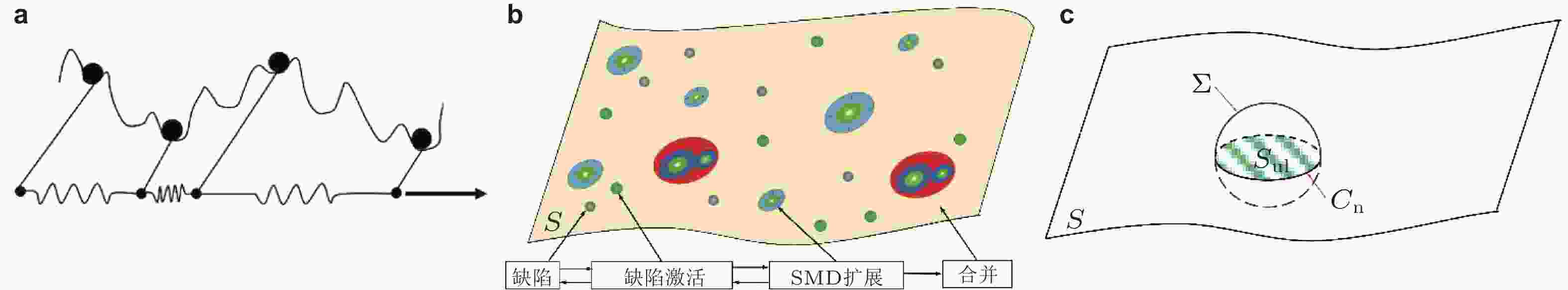 图 2 (a)非晶固体内部原子/分子运动分级关联示意图 (Rinaldi et al. 2011); (b)非晶固体在准点缺陷理论框架下微观变形描述, 包括初始结构QPD位点在热力耦合刺激作用下的激活、扩展和合并过程 (Rinaldi et al. 2011); (c)微剪切畴结构示意图 (Perez 1984)