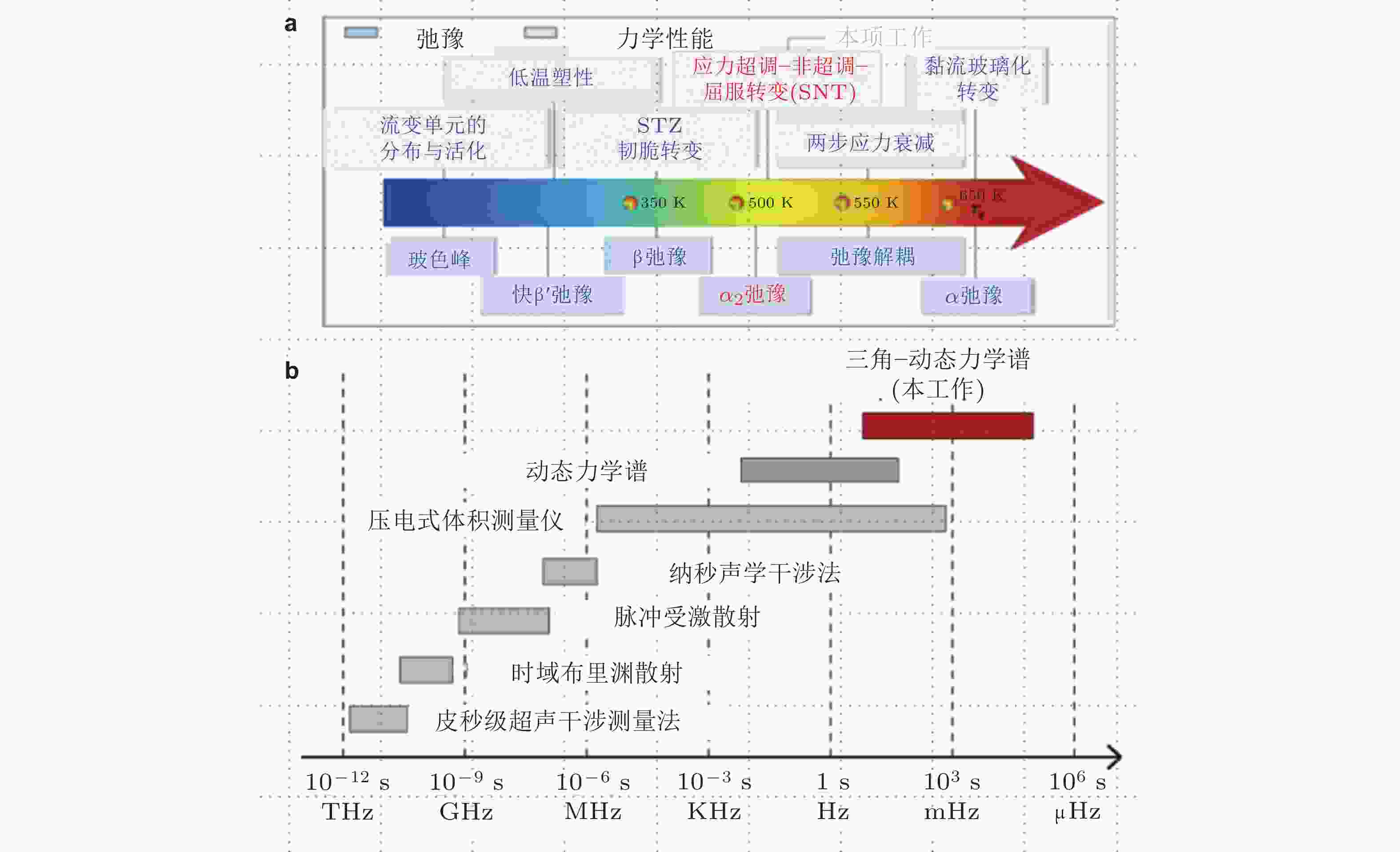 图 3 (a) 弛豫行为与力学性能之间的关联关系图 (Zhou et al. 2021), 特征温度以Al90Sm10非晶合金为例绘制; (b) 各类弛豫谱测试技术的频率范围与时间尺度分布 (Yang et al. 2024b)