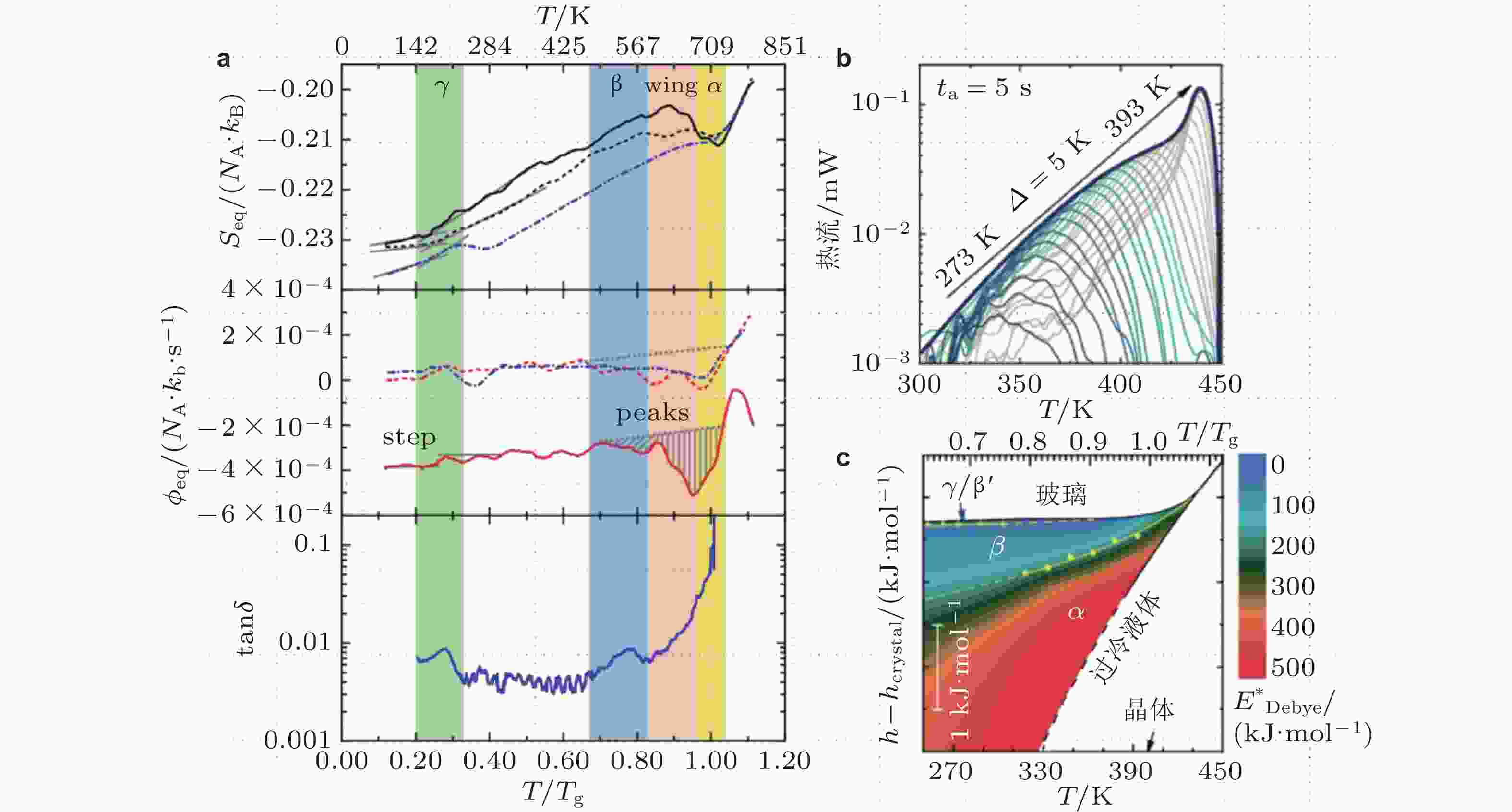 图 4 (a) 从等效构型熵导出等效构型热流过程(Spieckermann et al. 2022), γ 弛豫处的斜率变化由灰色实线标出, 在进入β弛豫以及β与α之间的过剩尾时出现显著的焓弛豫现象; (b)不同退火温度下的热流弛豫峰谱图 (Song et al. 2023); (c) 不同弛豫模式的温度−焓图(Song et al. 2023)