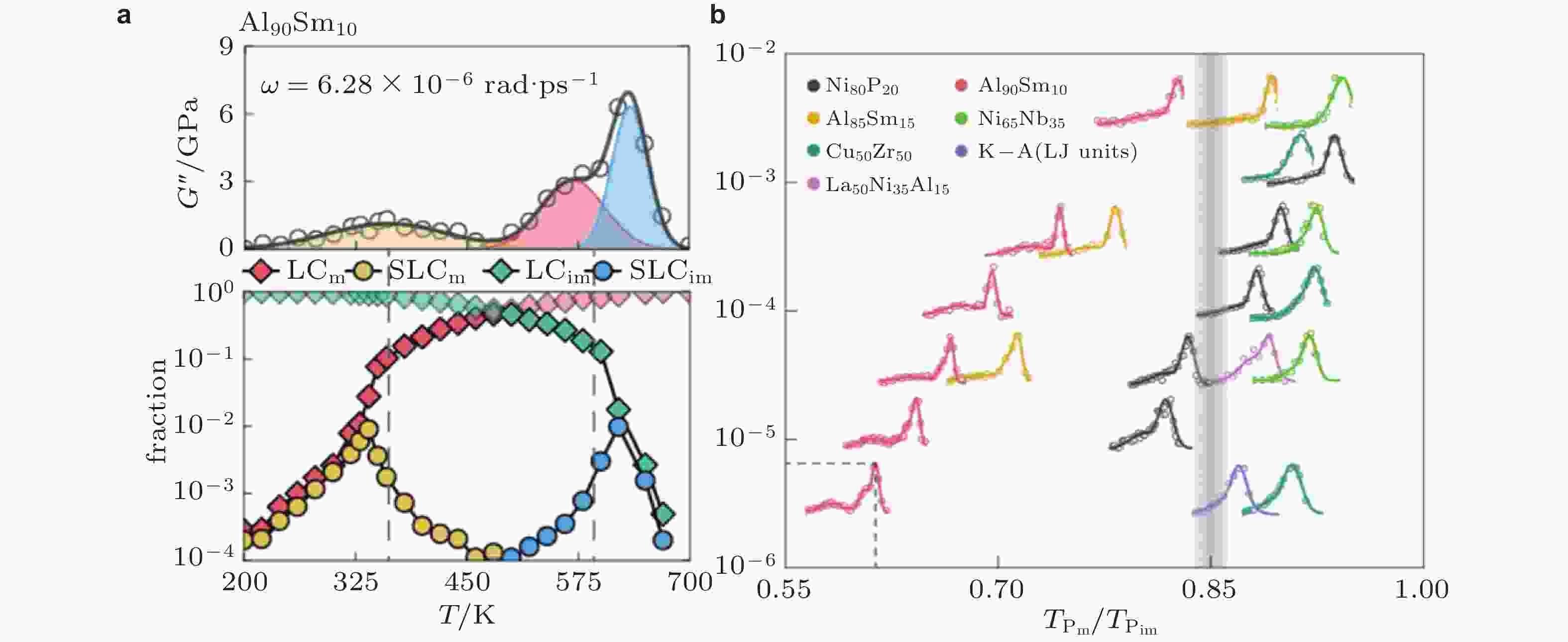 图 5 (a) Al90Sm10体系中, α和β弛豫峰分别对应非迁移性粒子逾渗和迁移性粒子逾渗的特征温度 (Gao et al. 2025); (b)三维体系的β弛豫形态(峰, 肩膀峰或过剩尾)取决于迁移性与非迁移性粒子逾渗温度的比值 (Gao et al. 2025)