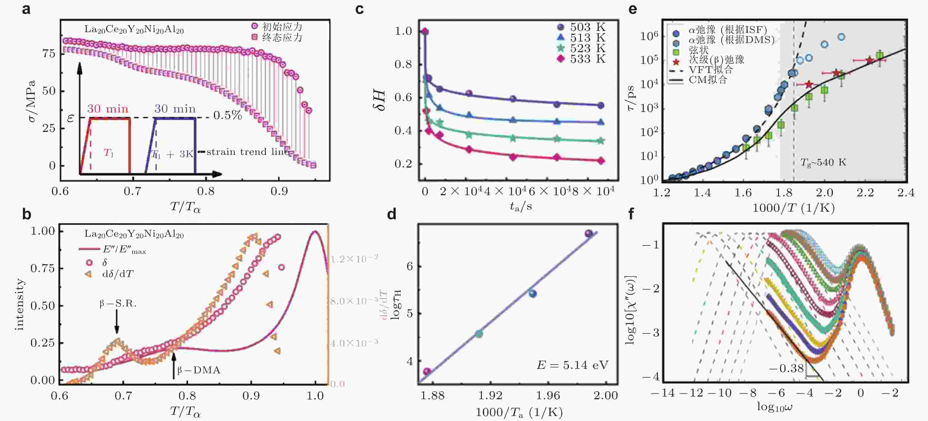 图 6 从室温到$ {T}_{\text{α} } $步进温度下 (a) La基高熵非晶合金应力松弛曲线和 (b) 对应的应力变化, 应力变化率以及归一化损耗模量的演化 (Duan et al. 2022); (c) 不同退火温度$ {T}_{\text{α}} $下归一化过剩焓$ \delta H $随退火时间的变化关系 (Duan et al. 2024); (d) 焓弛豫时间$ {\tau }_\text{H} $与退火温度倒数$ 1/{T}_{\text{α}} $的阿伦尼乌斯关系 (Duan et al. 2024); (e) Ni80P20非晶合金的弛豫图谱 (Zhou et al. 2024); (f) 三维玻璃中“过剩尾”现象的出现, 虚线表示估算得到的α弛豫峰位置 (Guiselin et al. 2022)