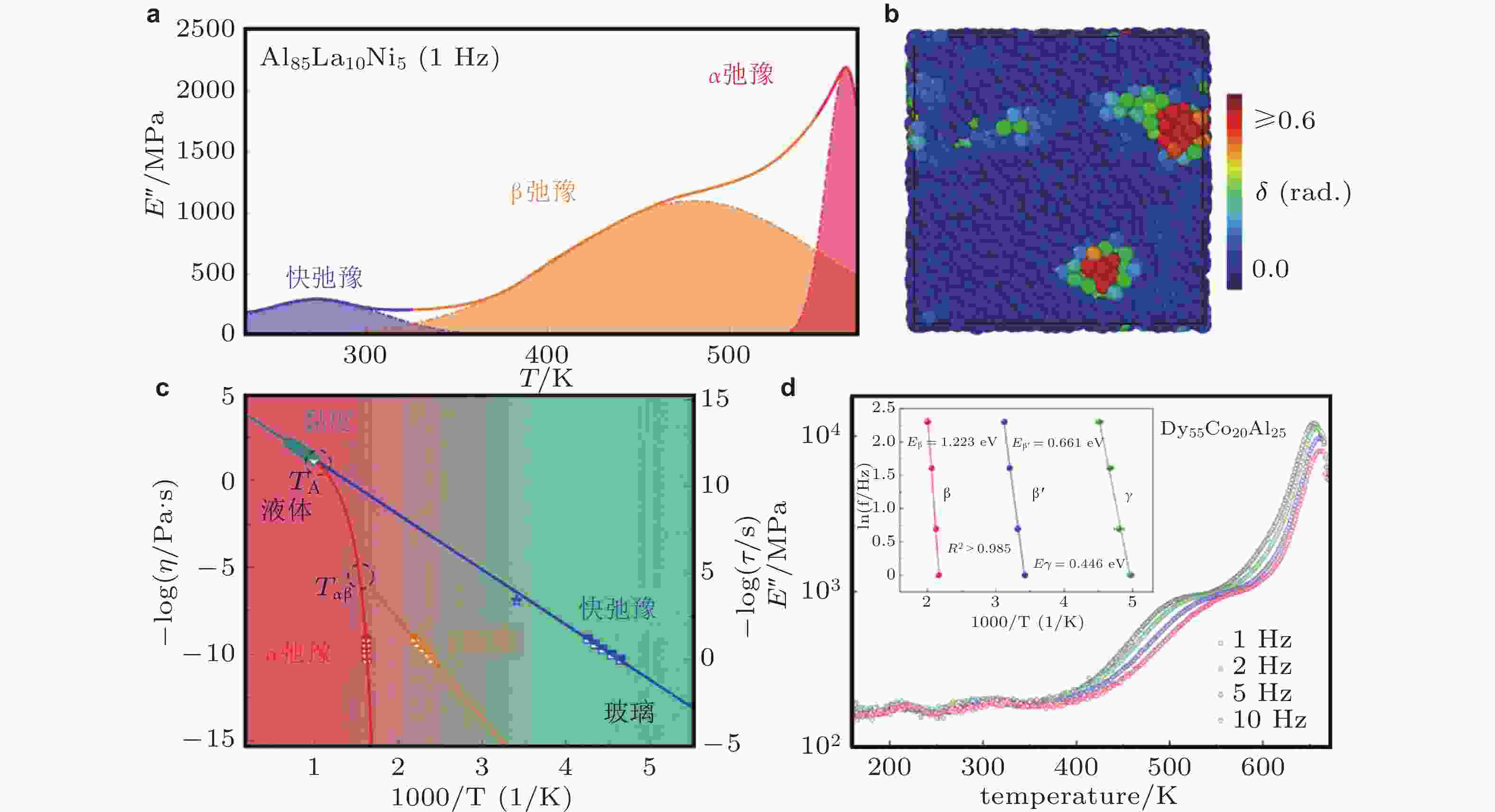 图 7 (a) 非晶合金中快速弛豫过程在动态弛豫谱中的呈现 (Chang et al. 2022); (b) 原子尺度的弹性与耗散(Yu & Wang 2024); (c) Y68.9Co31.1非晶合金的实验弛豫图谱 (Chang et al. 2022); (d) Dy55Co20A25非晶合金在驱动频率为1 ~ 10 Hz时损耗模量随温度的变化情况, 插图展示了根据阿伦尼乌斯关系拟合得到的不同弛豫过程的激活能 (Shao et al. 2023)