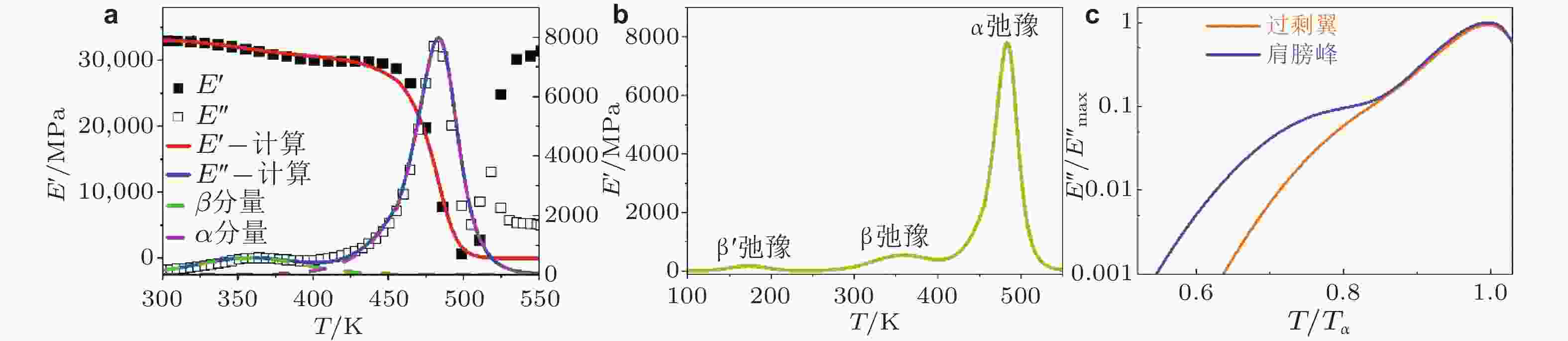 图 8 (a) La60Ni15Al25块体非晶合金动态力学参量随温度的演化, 实线为基于式 (34) 的拟合曲线, 绿色和紫色虚线分别为α弛豫和β弛豫对损耗模量的贡献, 当前模型对其他形式动态弛豫温度谱图的计算曲线; (b) 当前模型对不同弛豫模式计算, 包括明显分离的快$ \text{β} ' $弛豫过程; (c) 当前模型对$ \text{β} $弛豫的不同表现形式 (肩膀峰和过剩尾)的计算曲线 (Hao et al. 2022)