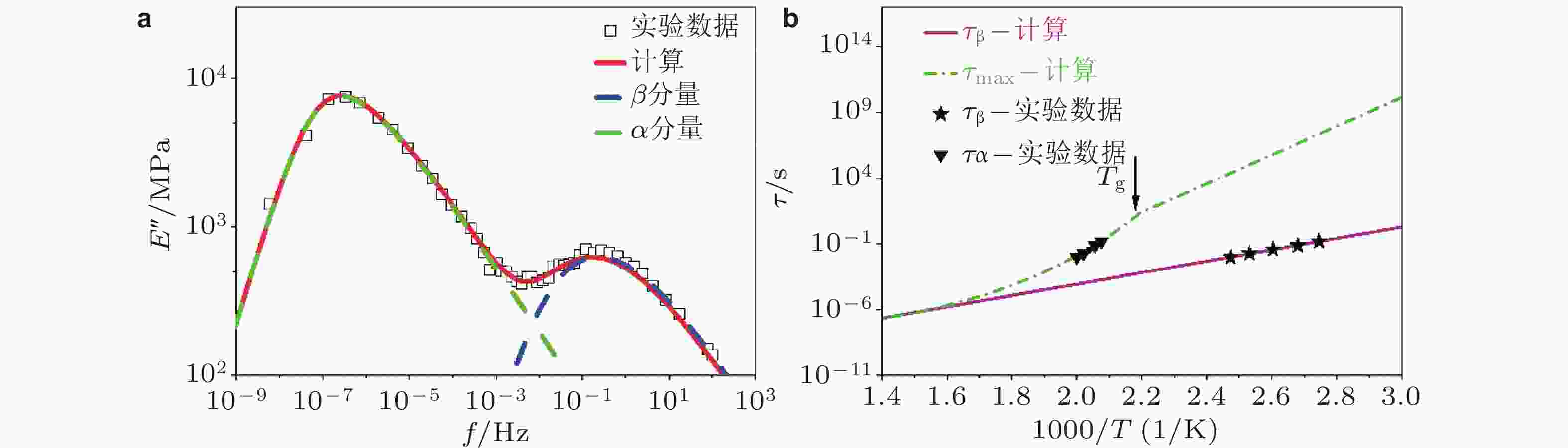 图 9 (a) La60Ni15Al25非晶合金损耗模量$ {E}'' $的频率域主曲线, 红色实线是基于准点缺陷理论所得计算曲线; 绿色和蓝色虚线分别为α和β两个弛豫模式对频率谱图的贡献; (b) α和β两种弛豫模式特征时间随温度的演化, 黑色符号为基于损耗模量曲线峰值位置$ \omega \tau =1 $确定的$ {\tau }_{\text{α}} $和$ {\tau }_{\text{β} } $的实验值; 紫色实线为根据Arrhenius公式计算所得$ {\tau }_{\text{β} } $随温度的演化; 绿色虚线表示为当前模型预测所得$ {\tau }_{\text{max}} $随温度演化规律 (Hao et al. 2022)
