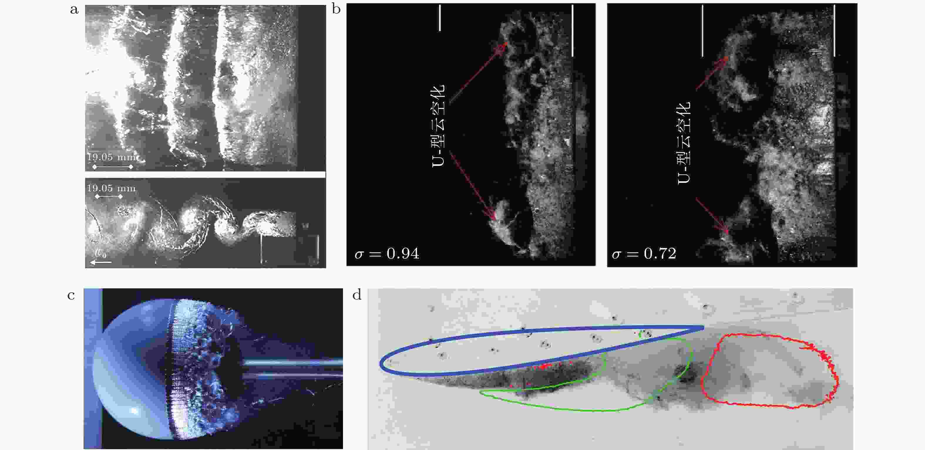 图 3 不同类型空化流场拟序结构实验结果: (a) 楔形体空化区 (Belahadji et al. 1995, Wu et al. 2021); (b) 水翼U形云空化 (Peng et al. 2016), 俯视图; (c)球体云空化 (de Graaf et al. 2017); (d)水翼云空化脱落过程 (Zhang et al. 2021a), 侧视图