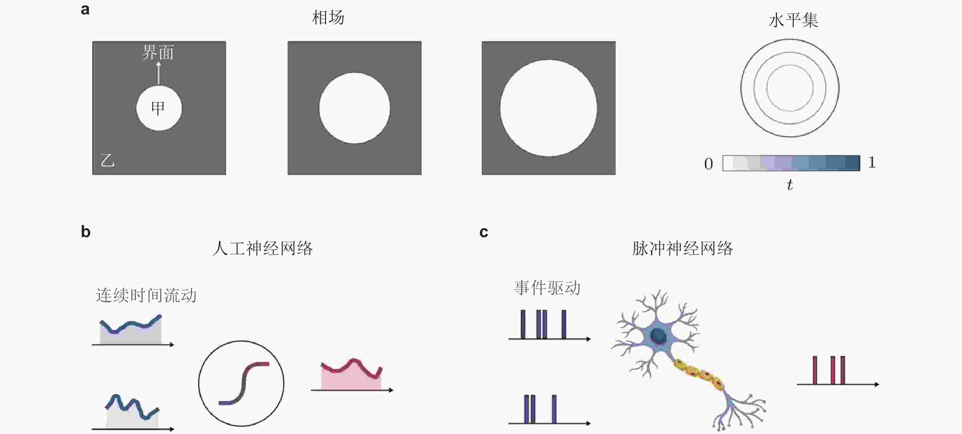图 3 (a) 微结构演化的相场与水平集描述; (b) ~ (c) 人工神经网络与脉冲神经网络 (Zhao & Xu 2025a)