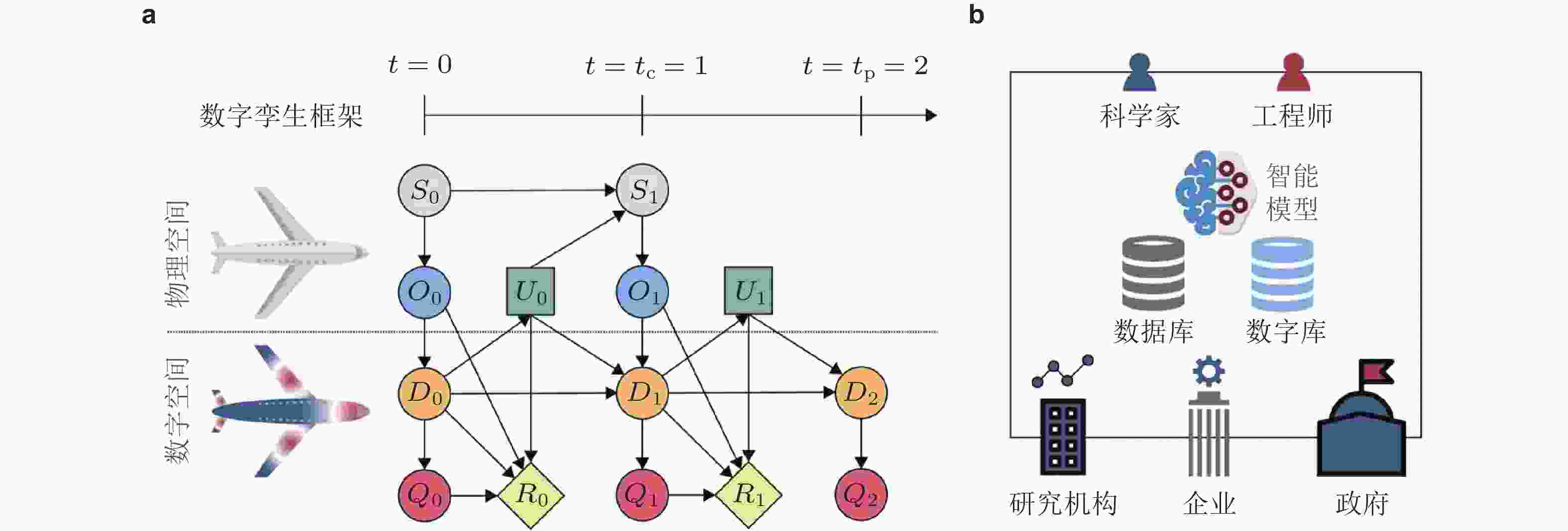 图 8 (a) 数字孪生框架 (S: 物理状态, O: 物理观测量, D: 数字状态, Q: 目标量, R: 奖励, U: 控制输入)(Kapteyn et al. 2021); (b) 开放科学生态