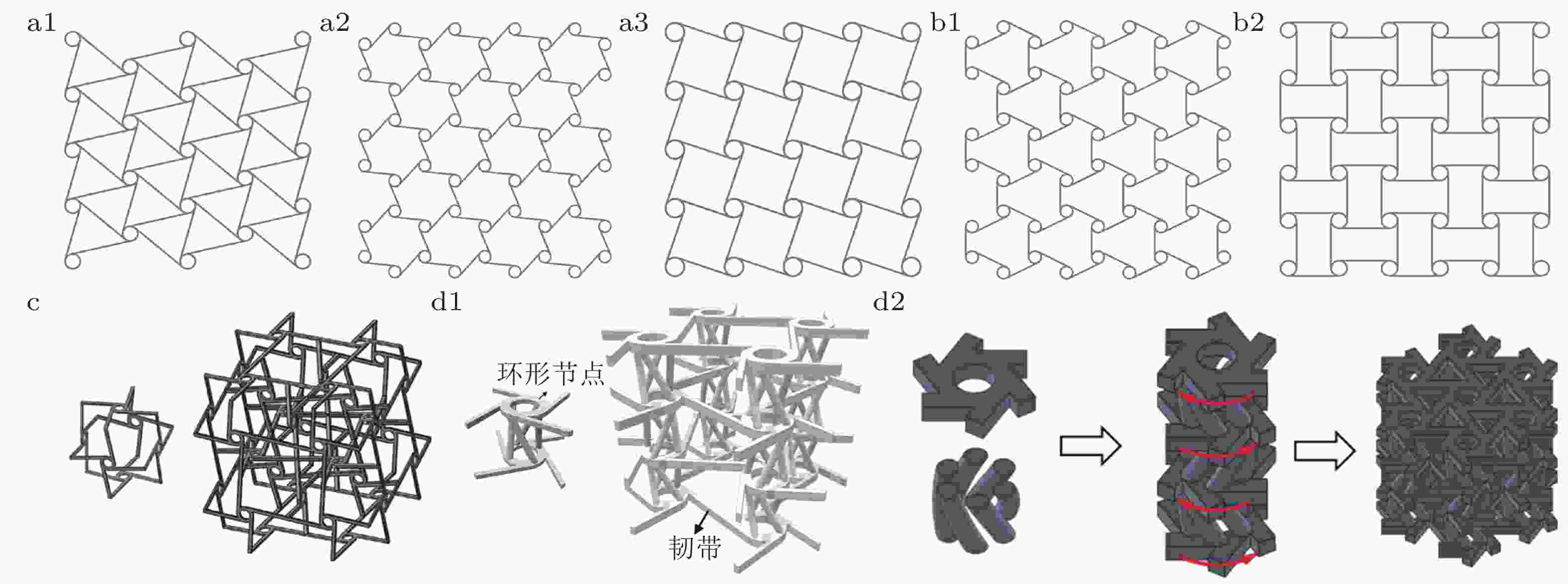 图 4 基于旋转机制的负泊松比超材料设计策略 (手性/反手性). (a) 二维手性蜂窝 (从左至右分别为 (a1) 二维六手性蜂窝、(a2) 二维三手性蜂窝和 (a3) 二维四手性蜂窝); (b) 二维反手性蜂窝 (从左至右分别为 (b1) 二维反三手性蜂窝和 (b2) 二维反四手性蜂窝); (c) 伪三维四手性点阵 (Fu et al. 2017); (d) 本征三维手性点阵 (从左至右分别为 (d1) 本征三维四手性点阵 (Fu et al. 2018) 和 (d2) 本征三维六手性点阵 (Jiao & Yan 2021))