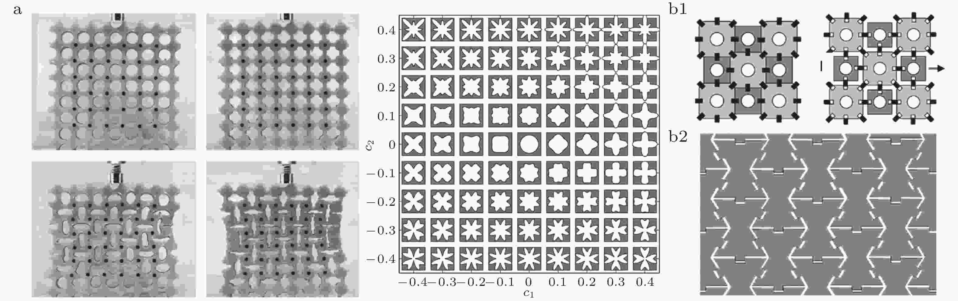 图 6 其他机制的负泊松比超材料设计策略. (a) 基于弹性不稳定性屈曲设计的负泊松比超材料 (Overvelde & Bertoldi 2014); (b) 基于刚体联动机制设计的负泊松比超材料 (分别为 (b1) 嵌锁联动结构 (Evans & Alderson 2000) 和 (b2) 内凹联动结构 (Ravirala et al. 2007))