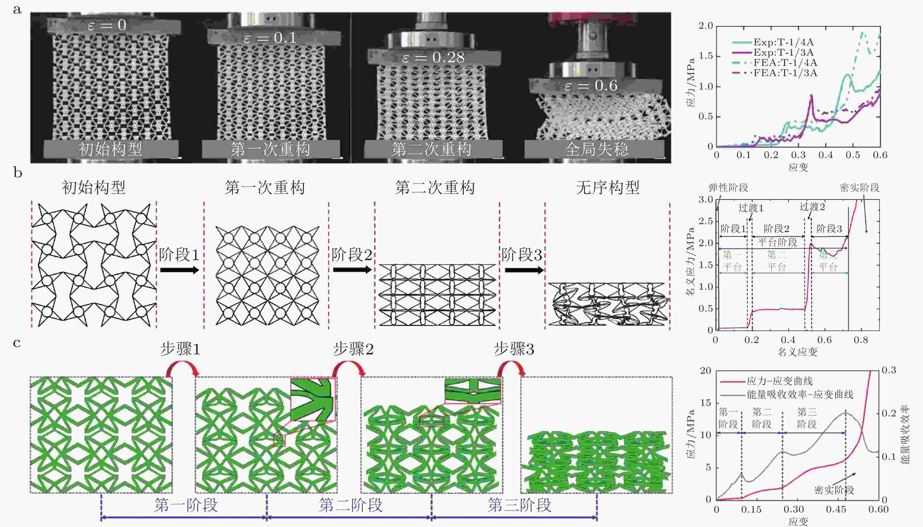 图 10 具有多平台响应特性的负泊松比缓冲吸能超材料设计策略. (a) 多尺度自相似设计 (Yu et al. 2024); (b) 多变形机制耦合设计 (Lu et al. 2022); (c) 子结构嵌套设计 (Wang & Liu 2024)