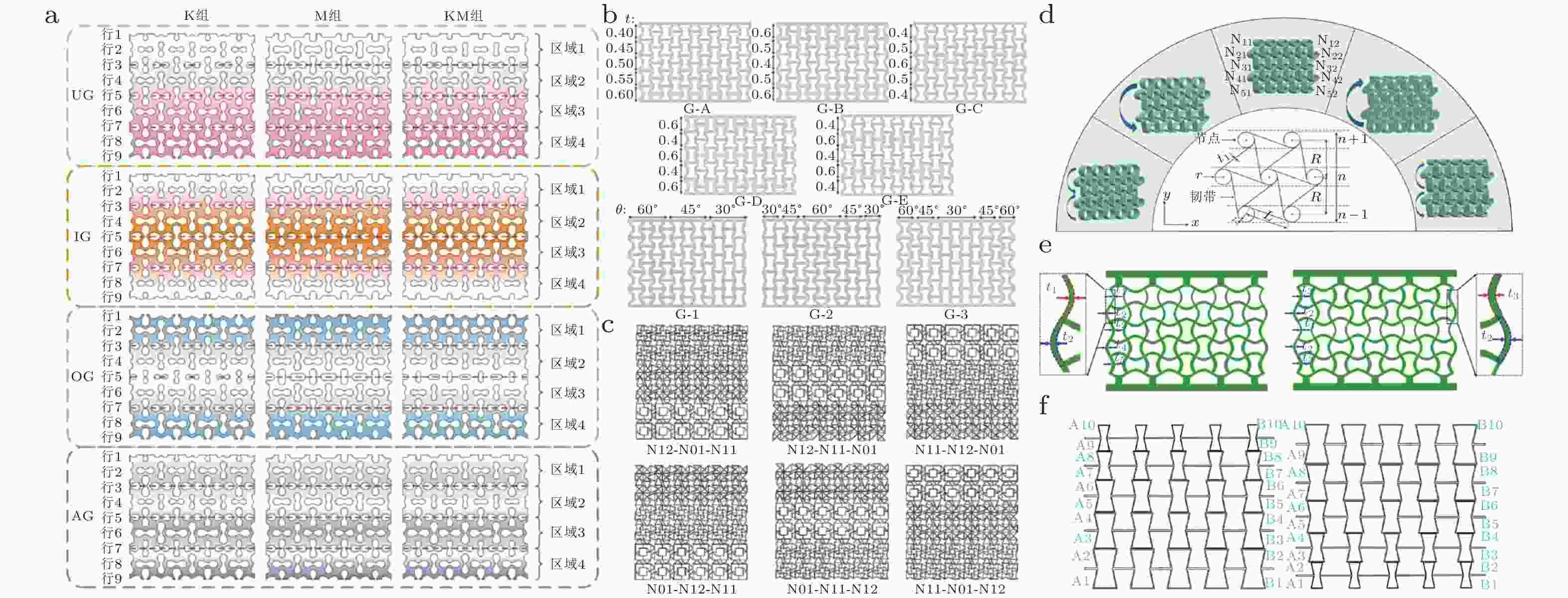 图 11 梯度负泊松比缓冲吸能超材料. (a) 花生型梯度结构 (Zhang et al. 2025c); (b) 内凹曲壁梯度结构 (Wang et al. 2023); (c) 梯度内凹−星形结构; (d) 梯度手性结构 (Chen et al. 2024c); (e) 梯度曲壁结构 (Zhang et al. 2022b); (f) 梯度内凹结构 (Zhang et al. 2025b)