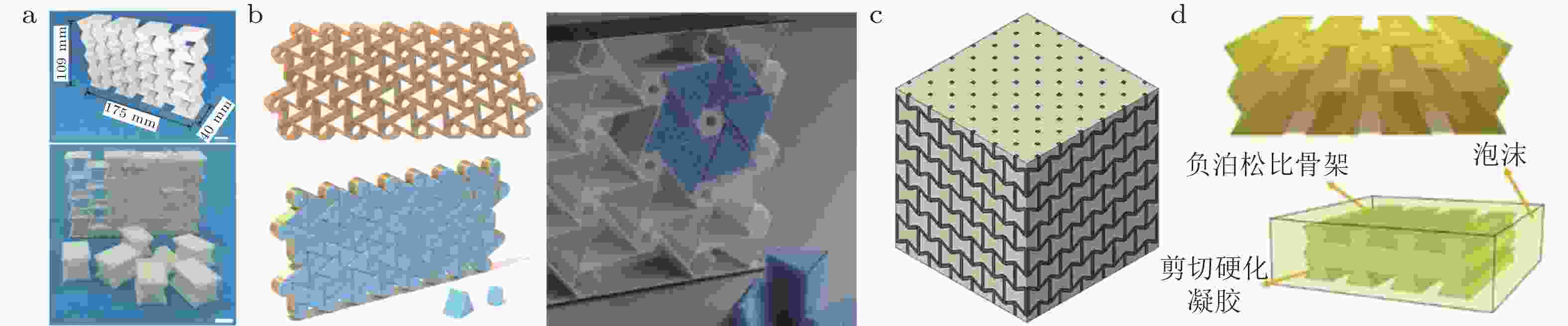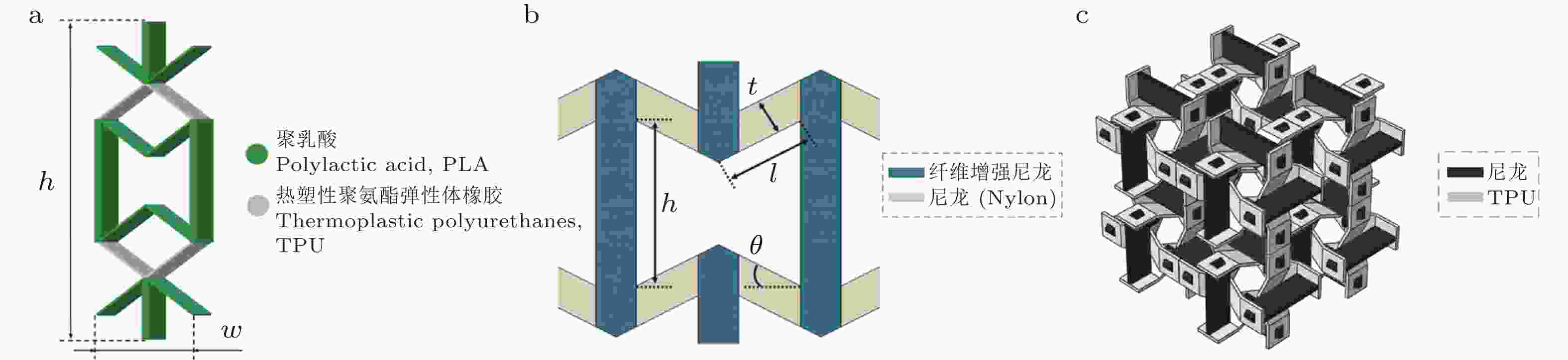 图 12 多材料负泊松比缓冲吸能超材料. (a) 双材料多稳态拉胀蜂窝 (Wu et al. 2024); (b) 双材料内凹六边形结构 (Günaydın et al. 2022); (c) 双材料拼装式内凹薄板点阵