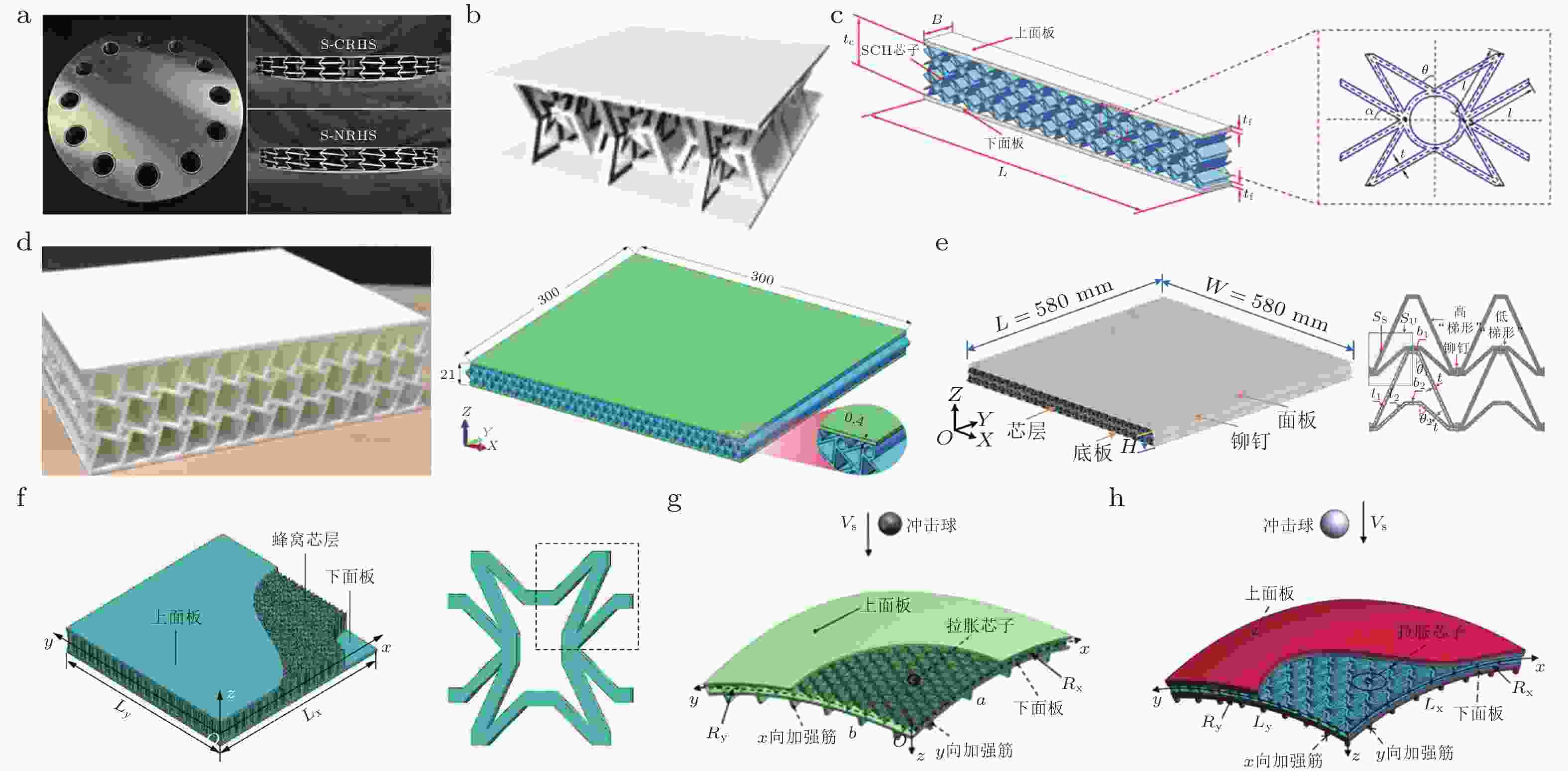 图 14 基于夹层结构集成的负泊松比缓冲吸能超材料. (a) 内凹六边形夹芯板 (Jiang et al. 2025); (b) 内凹−星形夹芯板 (Qu et al. 2025); (c) 星形−圆形夹芯板 (Lu et al. 2023); (d) 手性蜂窝夹芯板 (Chen et al. 2024b, Sadikbasha & Pandurangan 2023); (e) 双箭头夹芯板 (廖瑜 等 2025); (f) 星形夹芯板 (余阳和付涛 2023); (g) 功能梯度负泊松比多孔材料夹芯壳 (Fu et al. 2023); (h) 曲壁内凹蜂窝夹芯壳 (Fu et al. 2024)