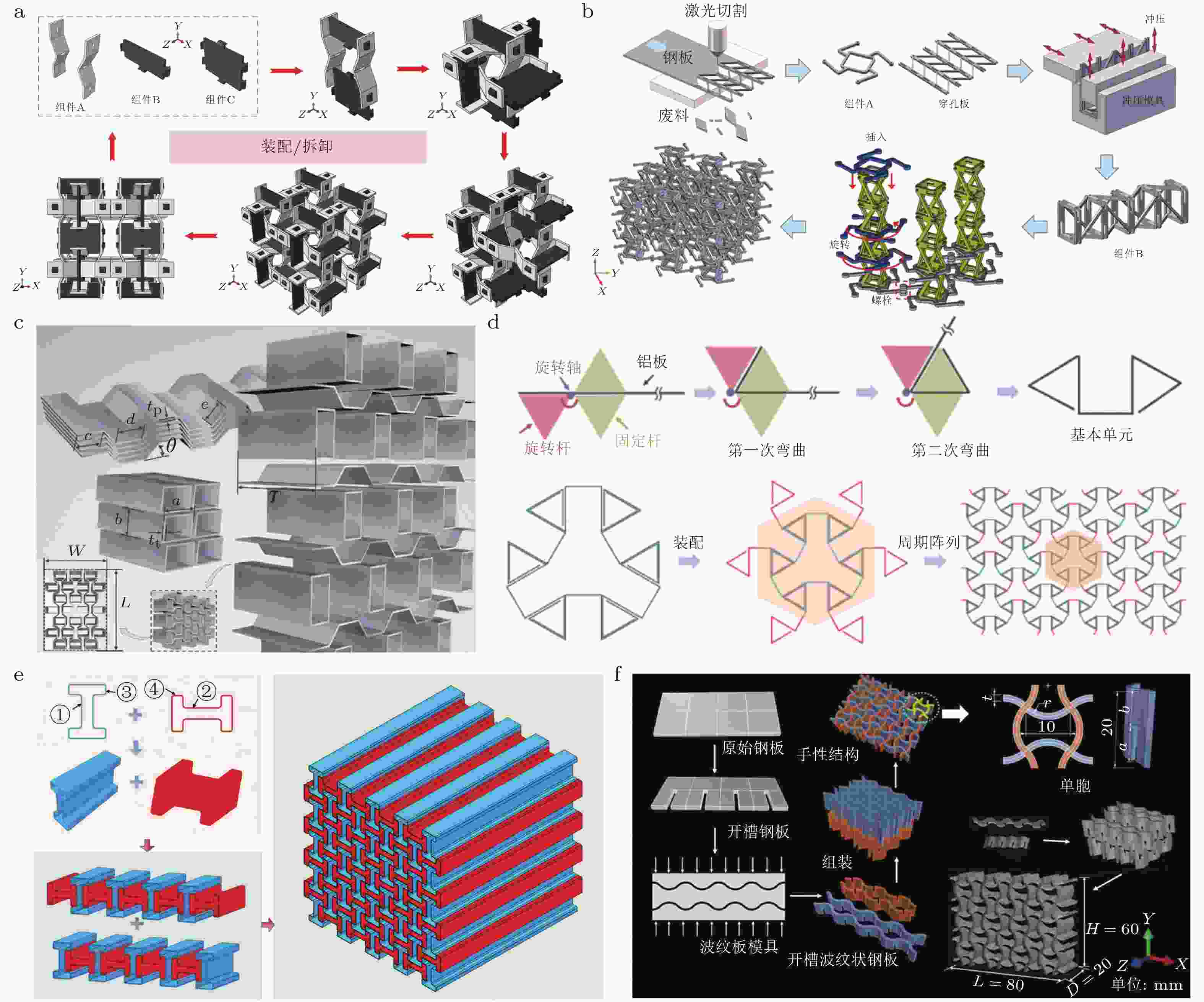 图 15 模块化负泊松比缓冲吸能超材料. (a) 拼装式内凹薄板点阵超材料; (b) 拼装式压扭超材料 (Wei et al. 2025); (c) 拼装式波纹板−矩形超材料 (Jiang et al. 2023); (d) 自锁手性蜂窝 (Niu et al. 2025); (e) 拼装式缺失肋结构 (Zhu et al. 2025); (f) 拼装式手性结构 (Zhang et al. 2022c)