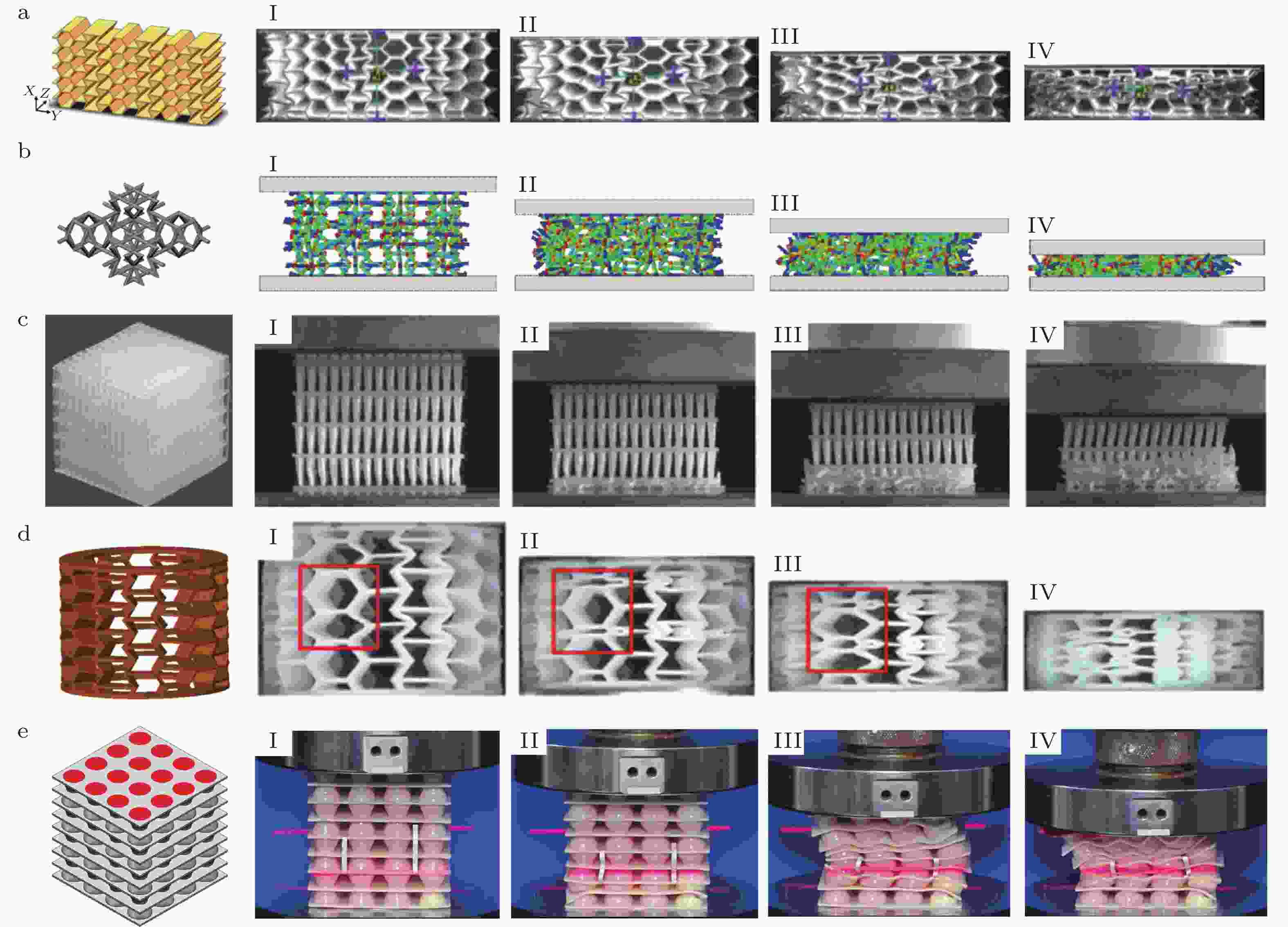 图 16 零泊松比缓冲吸能力学超材料及其变形过程. (a) AuxHex蜂窝 (Xu et al. 2019); (b) 三维AuxHex点阵 (Guo et al. 2020b); (c) 类乌贼骨结构 (Mao et al. 2021); (d) AuxHex圆柱结构 (Liu et al. 2020); (e) 零泊松比薄壳点阵