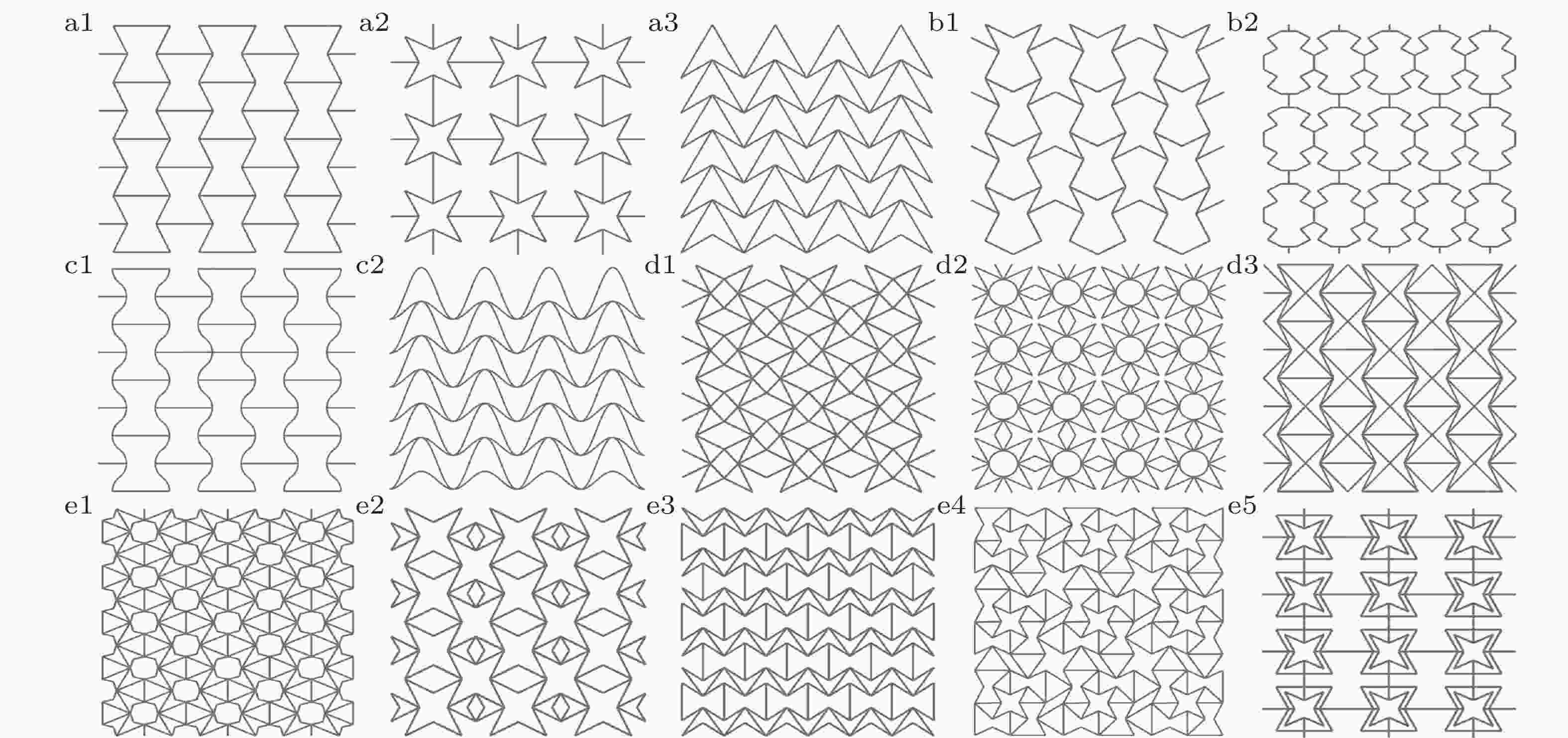 图 1 基于内凹机制的负泊松比蜂窝设计策略. (a) 典型内凹蜂窝 (从左至右分别为 (a1) 内凹六边形蜂窝、(a2) 内凹星形蜂窝和 (a3) 内凹双箭头蜂窝); (b) 其他内凹蜂窝 (从左至右分别为 (b1) 半内凹八边形蜂窝和 (b2) 多内凹角蜂窝); (c)“化直为曲”内凹蜂窝 (从左至右分别为 (c1) 内凹曲臂蜂窝和 (c2) 内凹双U形蜂窝); (d) 嵌入支撑单元的内凹蜂窝 (从左至右分别为 (d1) 星形−菱形蜂窝、(d2) 星形−圆形蜂窝和 (d3) 内凹−三角形蜂窝); (e) 通过经典构型组合重构得到的内凹蜂窝 (从左至右分别为 (e1) 和 (e2) 星形−双箭头蜂窝、(e3) 内凹−双箭头蜂窝、(e4) 和 (e5) 内凹−星形蜂窝)