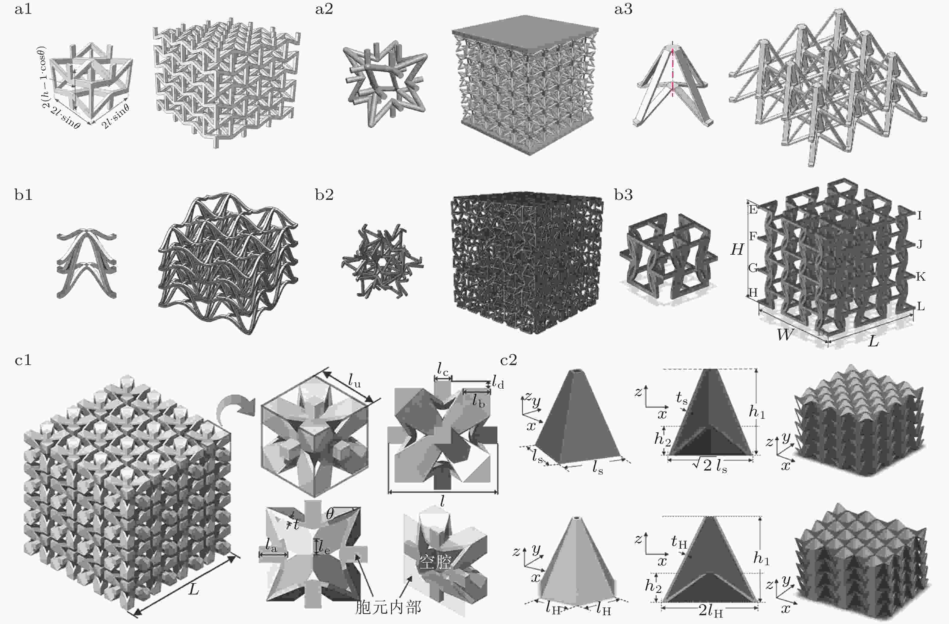 图 2 基于内凹机制的负泊松比点阵超材料设计策略. (a) 典型内凹点阵 (从左至右分别为 (a1) 内凹六边形点阵 (王信涛 2018)、(a2) 内凹星形点阵 (薛玉祥 2021) 和 (a3) 内凹双箭头点阵 (Wang et al. 2018b)); (b) 其他内凹点阵 (从左至右分别为 (b1) 双U形点阵 (Yang & Ma 2021)、(b2) 内凹−星形点阵 (王玮婧 等 2024) 和 (b3) 曲壁内凹点阵 (Jiang et al. 2022)); (c) 本征三维负泊松比内凹点阵 (从左至右分别为 (c1) 三维内凹薄板点阵 (Wang et al. 2022) 和 (c2) 三维双箭头薄板点阵 (Guo et al. 2022))