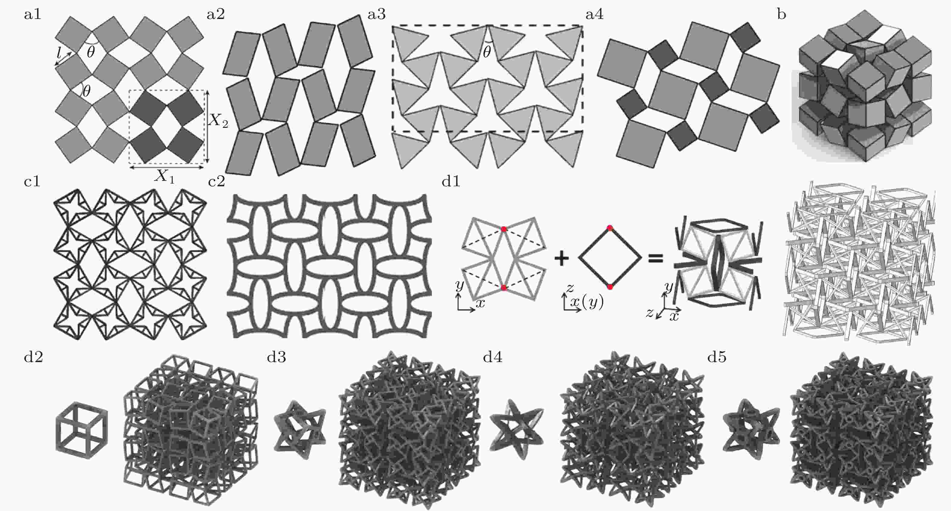 图 3 基于旋转机制的负泊松比超材料设计策略 (旋转刚体/旋转桁架). (a) 二维旋转刚体结构 (Grima & Evans 2000)(从左至右分别为 (a1) 旋转方形结构、(a2) 旋转矩形结构、(a3) 旋转三角形结构和 (a4) 旋转混杂四边形结构); (b) 三维旋转立方体结构 (Andrade et al. 2018); (c) 二维旋转桁架结构 (从左至右分别为 (c1) 旋转−星形结构 (Li et al. 2021) 和 (c2) 旋转−内凹六边形结构 (Hao et al. 2022)); (d) 三维旋转桁架点阵 (Gao et al. 2021, Yang et al. 2025)(分别为 (d1) 旋转桁架点阵、(d2) 旋转六面体点阵、(d3) 旋转手性点阵、(d4) 旋转内凹点阵和 (d5) 复合旋转点阵)