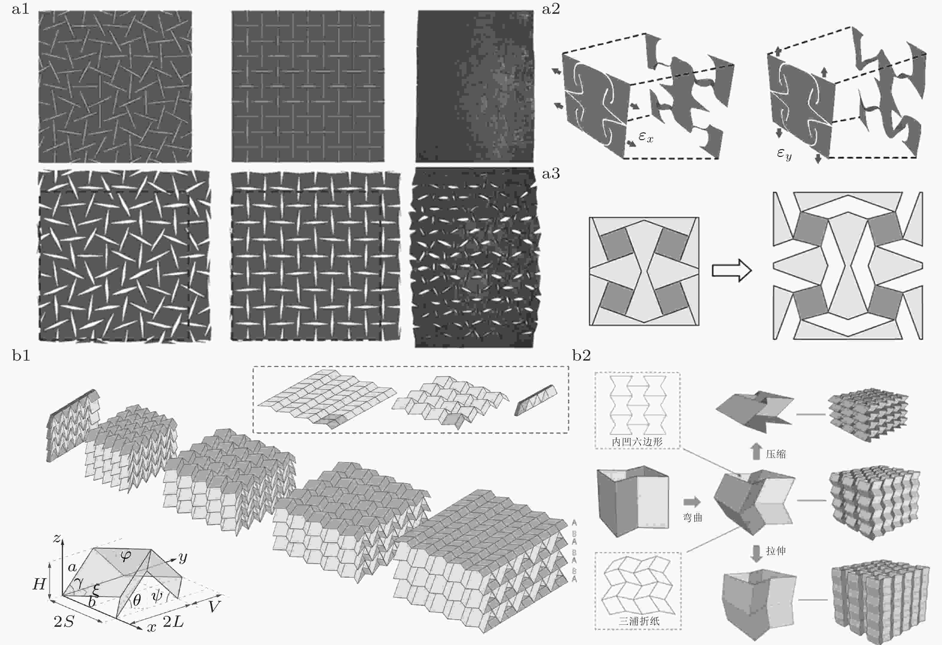 图 5 基于剪纸/折纸机制的负泊松比超材料设计策略. (a) 剪纸负泊松比超材料 (从左至右分别为 (a1) 有序/无序剪纸超材料 (Grima et al. 2016)、(a2) 弧形剪纸超材料 (Song et al. 2025) 和 (a3) 方形剪纸超材料 (Rafsanjani & Pasini 2016)); (b) 折纸负泊松比超材料 (从左至右分别为 (b1) 三浦折纸超材料 (Schenk & Guest 2013) 和 (b2) 内凹折纸超材料 (Li et al. 2022))