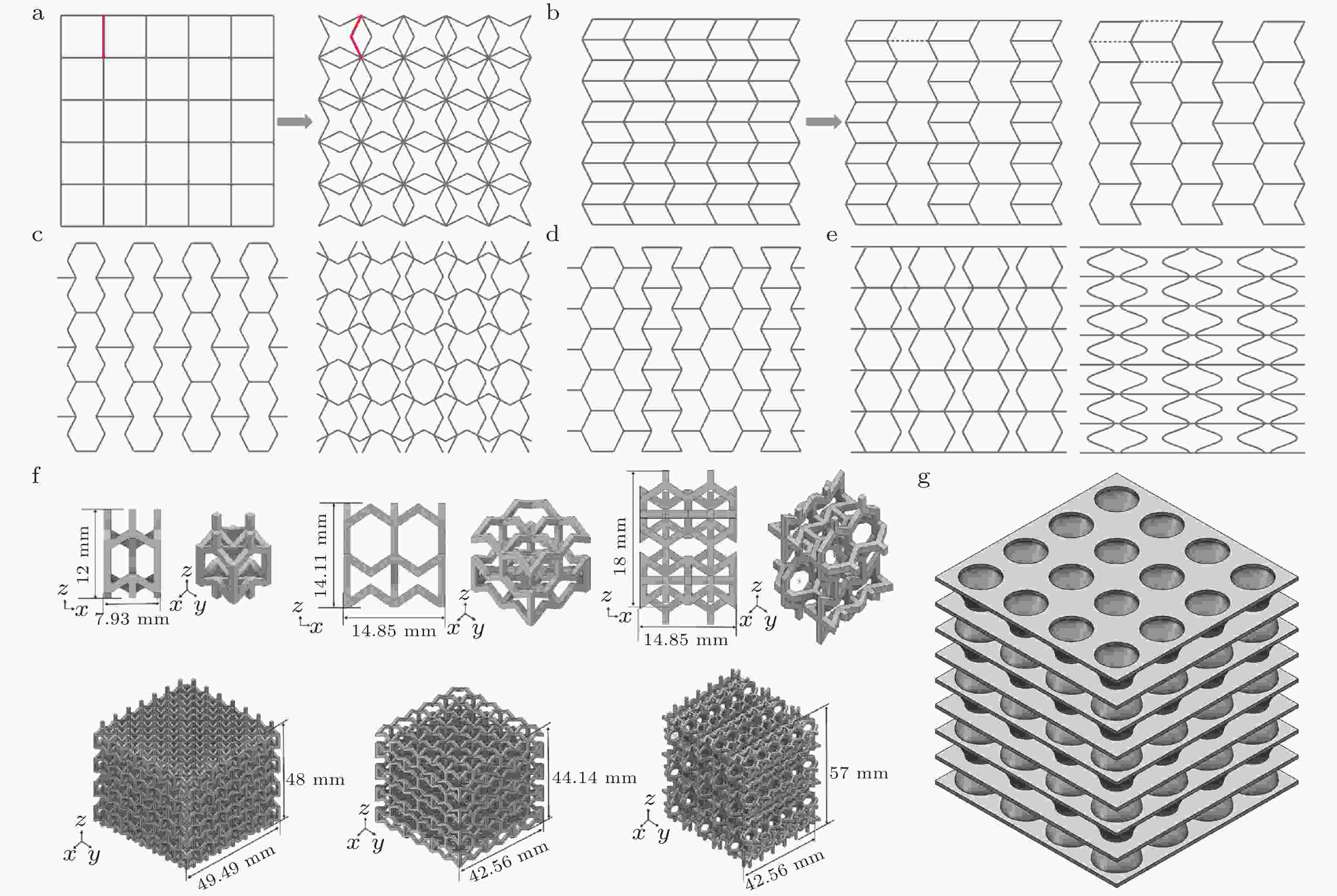 图 7 零泊松比超材料设计策略. (a) 类矩形设计策略; (b) 类平行四边形设计策略; (c) 半重入设计策略; (d) 正/负泊松比单元组合设计策略; (e) 刚柔串联设计策略; (f) 伪三维零泊松比超材料设计策略 (Sahariah et al. 2023); (g) 本征三维零泊松比超材料设计策略