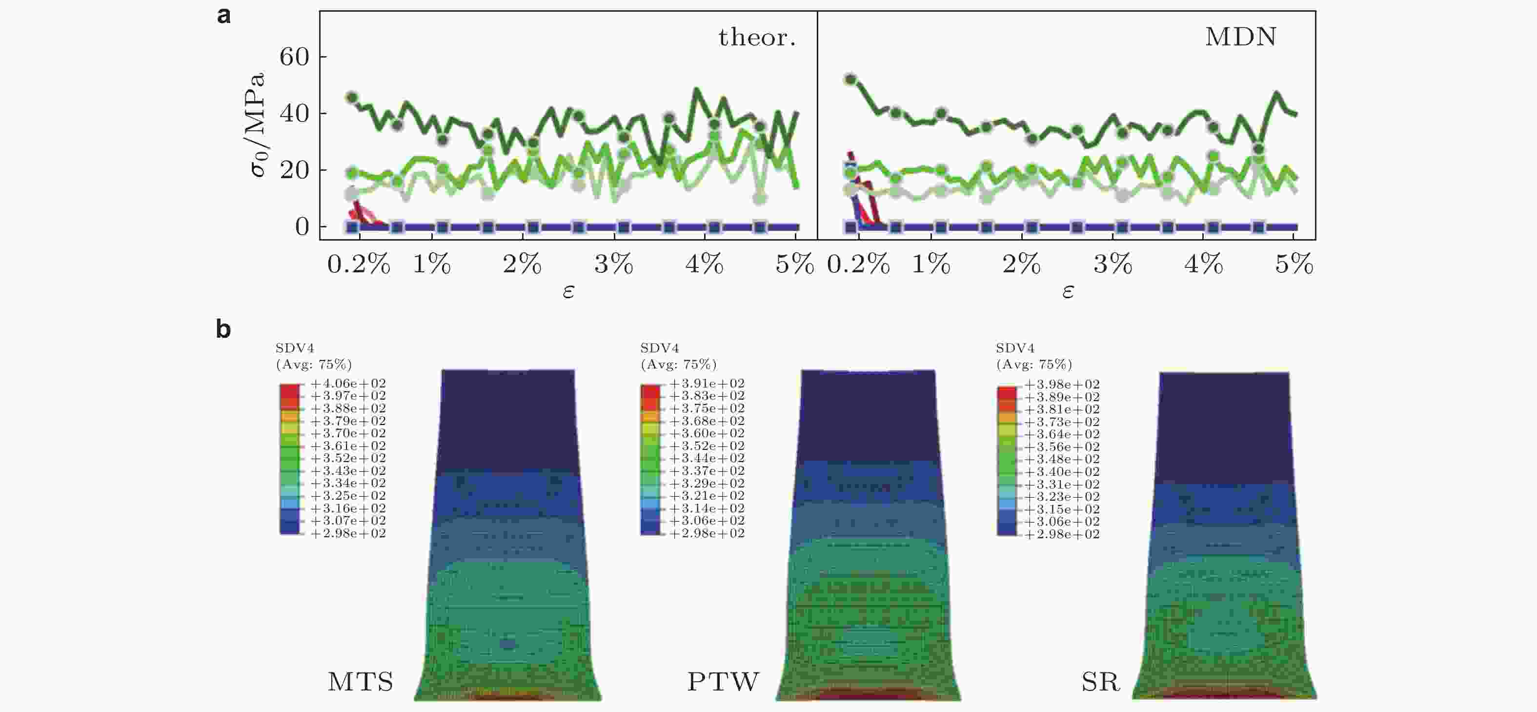 图  10  流变应力预测模型结果对比图. (a) MDN预测结果与理论结果对比(Gu Y et al. 2024), (b) SR预测结果与经典模型对比(Versino et al. 2017)
