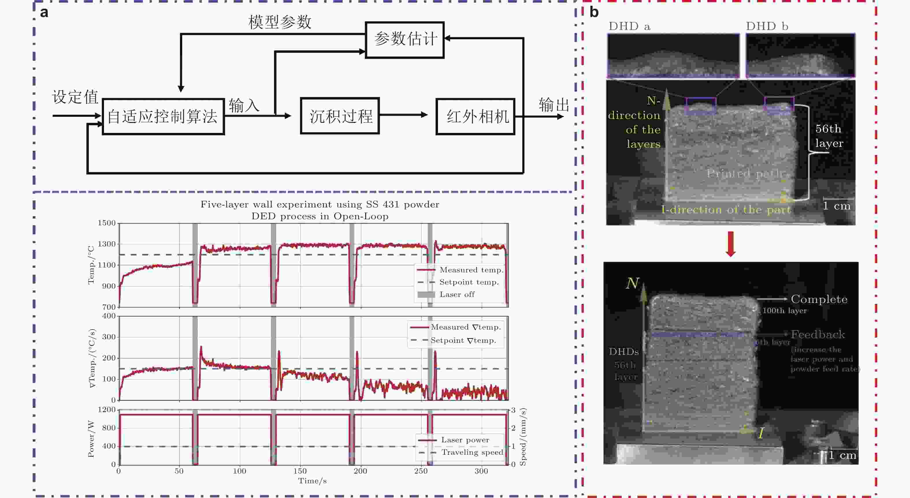 图 10 在线质量监测与控制. (a)自适应控制算法及温度、冷却速率控制结果(van Blitterswijk et al. 2025), (b)高度偏差的在线监测及缺陷矫正(Feng et al. 2025b)