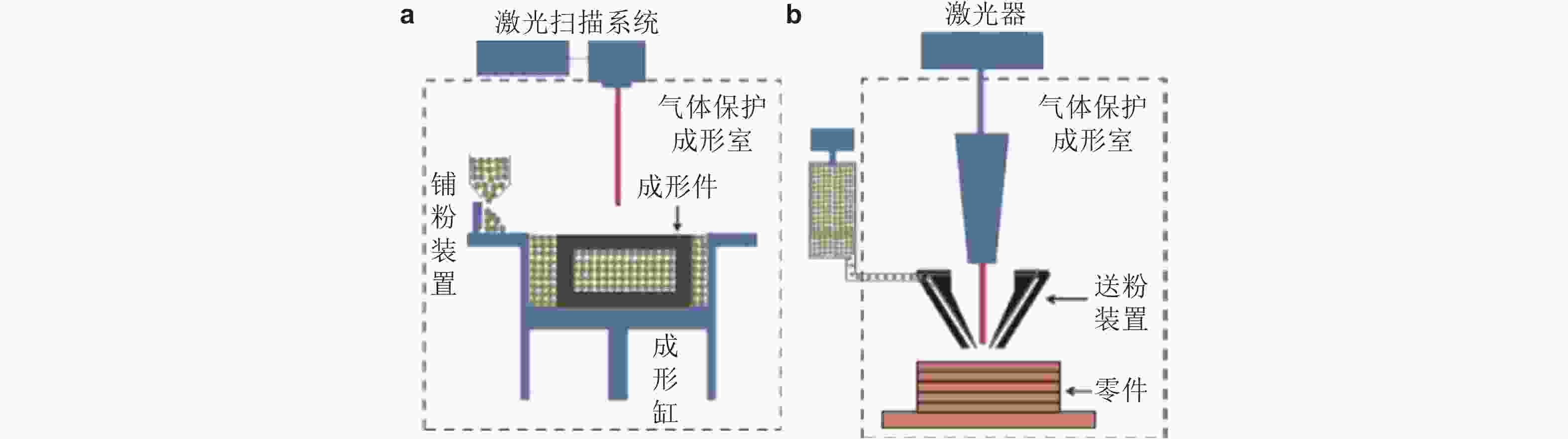 图 1 金属增材制造系统示意图(廉艳平 et al. 2021). (a)LPBF技术制造系统, (b)LDED技术制造系统