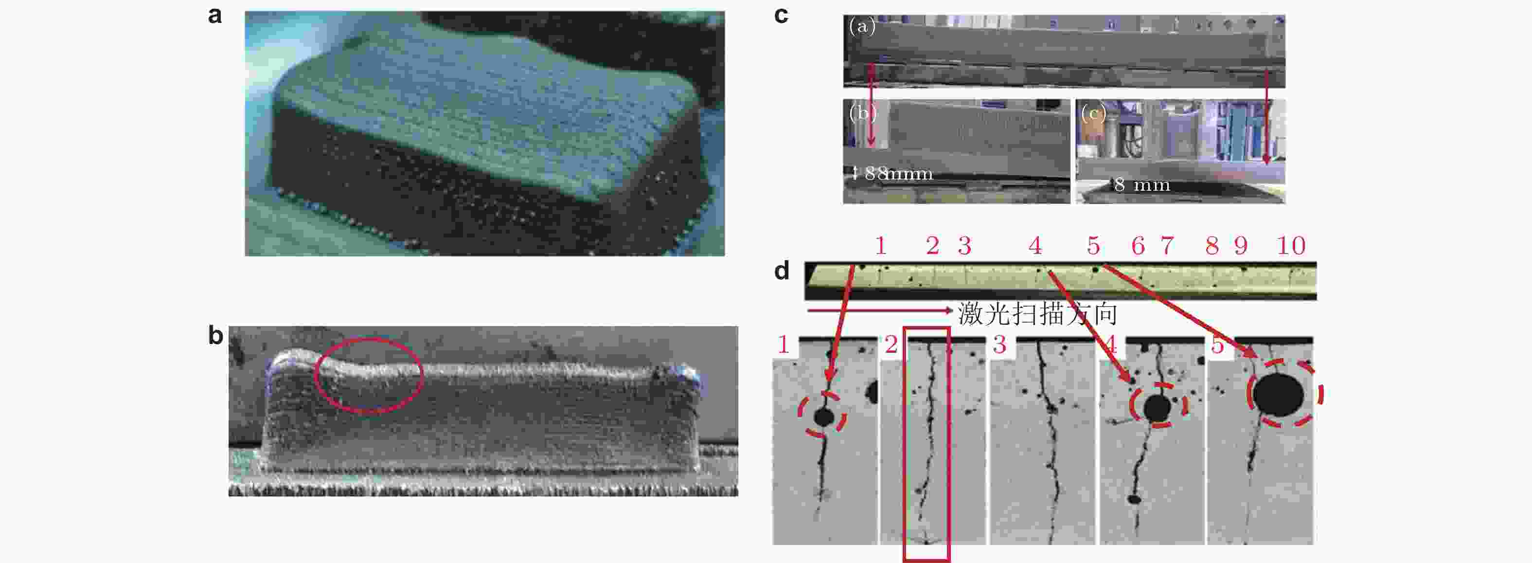 图 2 LDED工艺下的典型缺陷类型. (a)平面度缺陷(Chen et al. 2021a), (b)熔融塌陷缺陷, (c)变形(Qiu et al. 2015), (d)开裂