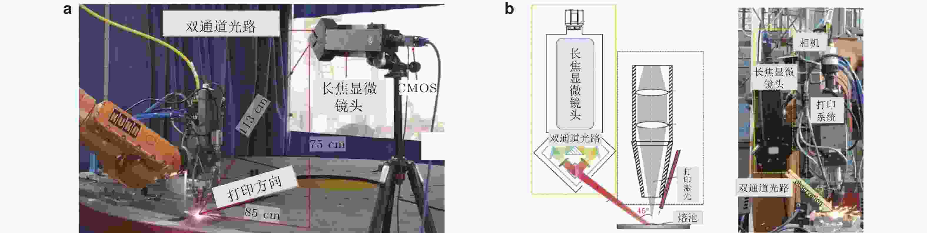 图 3 不同的相机监测视角示意图. (a) LDED工艺下相机位置固定的欧拉视角(Hao et al. 2020), (b) LDED工艺下相机跟随激光器运动的旁轴拉格朗日视角(Feng et al. 2022b)